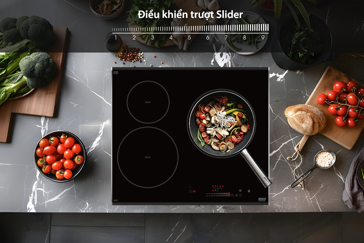 Bảng điều khiển phím cảm ứng trượt Slider siêu nhạy với 9 mức công suất độc lập cho 2 vùng nấu linh hoạt dễ dàng sử dụng, dễ thao tác với cả người cao tuổi và trẻ em