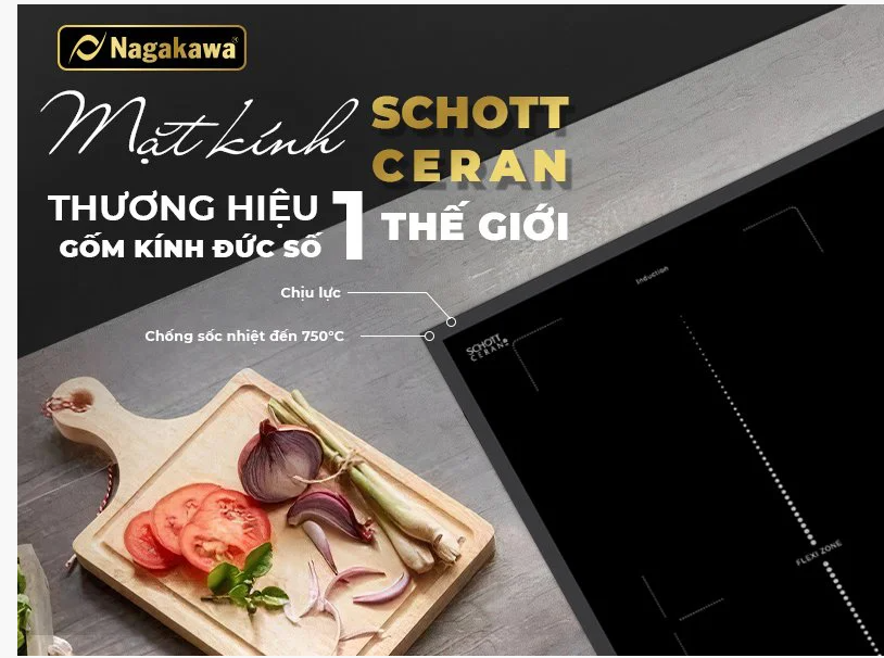 Mặt bếp điện từ thông minh Nagakawa NK3C05MSF làm từ kính Schott Ceran – thương hiệu gốm kính Đức số 1 thế giới – được làm từ gốm sứ thủy tinh đặc biệt có khả năng chịu lực, chịu nhiệt và khả năng va đập tốt, chống lại những cú sốc nhiệt đột ngột lên đến 750°C.