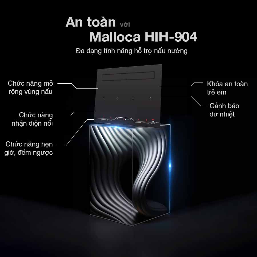 Bếp từ kết hợp với máy hút khói Malloca có mức điều chỉnh nhiệt độ và công suất nấu đa dạng với 9 mức độ khác nhau, để bạn có thể thoải mái lựa chọn chức năng phù hợp với từng loại thực phẩm đảm bảo bữa ăn trong gia đình luôn được thơm ngon.