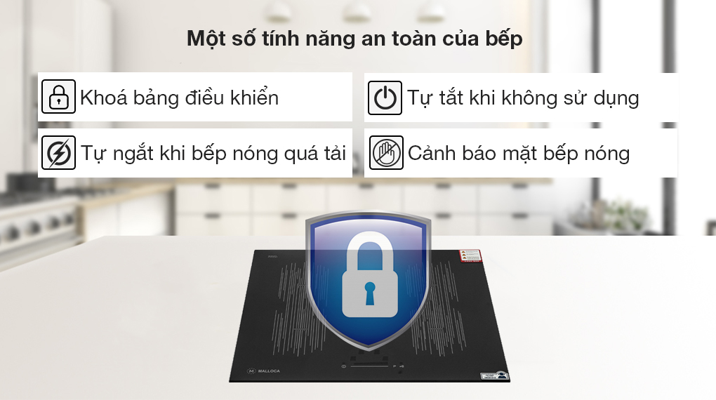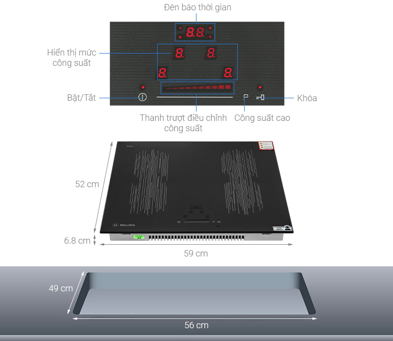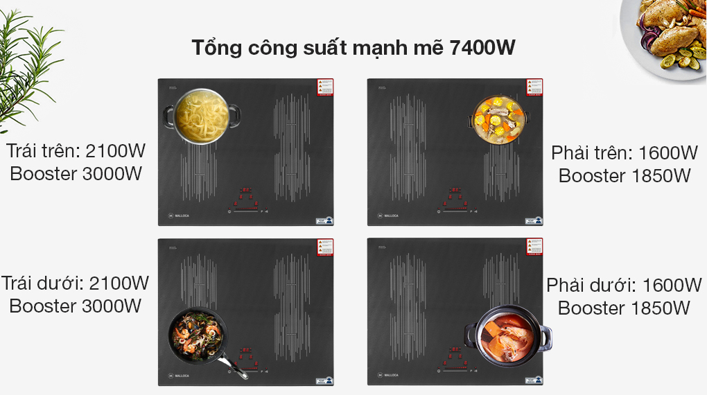 – Mẫu bếp từ Malloca này có tổng công suất 7400W.