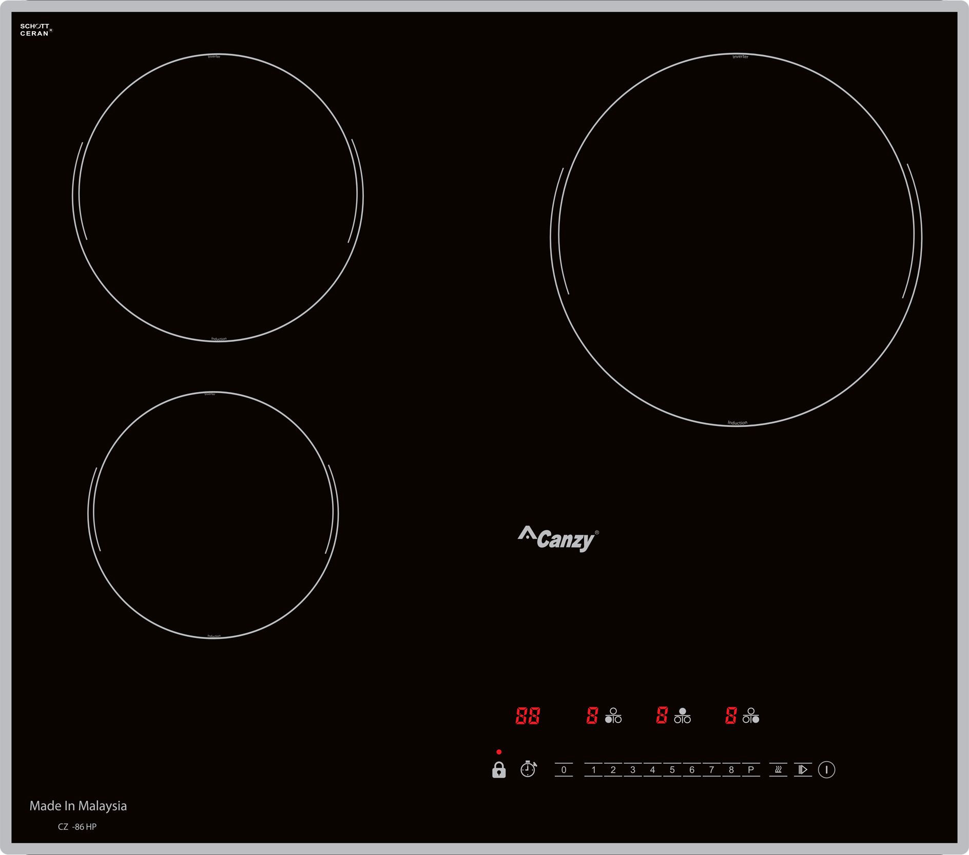Bếp từ Canzy CZ 86HP có 3 vùng nấu cảm ứng từ siêu lớn giúp bạn dễ dàng nấu món ăn mà không cần sợ nồi quá to không phù hợp với mặt bếp. Bếp được thiết kế lắp âm sang trọng, giúp bạn giảm thiểu đi đến 70% không gia so với lắp dương và những loại bếp gas thông thường khác.
