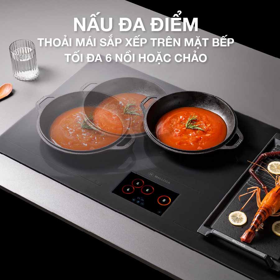 Bếp từ Malloca MH-92TFT thuộc dòng bếp từ đa điểm, có thể nấu được tối đa 6 nồi/chảo cùng lúc trên bất kỳ vị trí nào trên mặt bếp, phù hợp với gia đình có nhu cầu nấu nướng lớn. Tổng công suất tối đa đạt 9200W, đem đến khả năng nấu nướng nhanh chóng, tiện lợi, tiết kiệm thời gian cho người nội trợ.