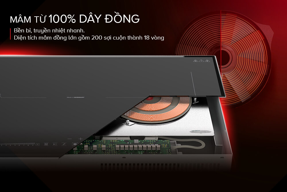 Bếp đôi điện từ Mutlich MIG9009 sở hữu 2 vùng nấu rộng rãi với mâm từ bằng đồng nguyên chất bền bỉ, kết cấu dày dặn với 18 vòng và 200 sợi. Với kết cấu dày dặn như vậy giúp sản phẩm truyền nhiệt tốt hơn. Ngoài ra, bếp có chức năng Booster giúp đẩy công suất lên đến 3000W giúp bạn nấu nướng nhanh và tiết kiệm thời gian hơn.