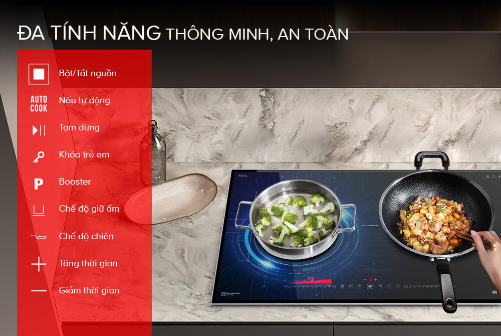 Bếp đôi điện từ Mutlich MIG9009 được tích hợp các tính năng an toàn nhằm mang đến sự tiện lợi khi sử dụng cho người tiêu dùng. Bên cạnh việc sở hữu các tính năng như hẹn giờ tới 99 phút, khóa trẻ em an toàn, bếp Mutlich MIG9009 còn có: Chế độ chiên riêng biệt, chế độ tạm dừng nấu, chế độ ủ ấm/rã đông cùng khả năng tự động nhận diện vùng nấu. Ngoài ra, bếp Mutlich MIG9009 còn có bộ lọc khử nhiễu từ EMC giúp bảo vệ các linh kiện trong máy và kéo dài tuổi thọ sản phẩm.
