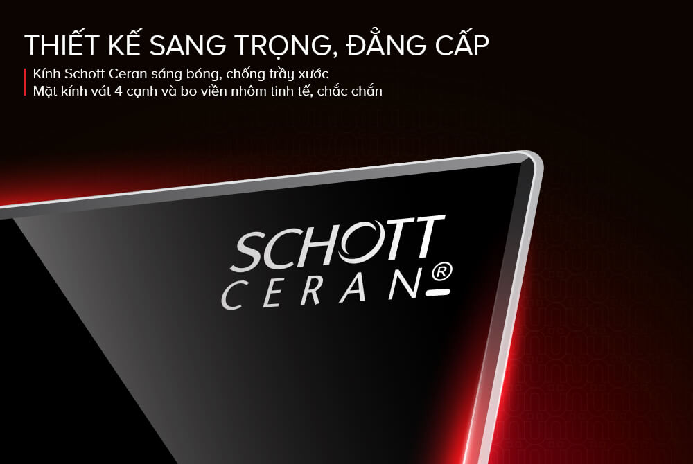 Bếp đôi điện từ Mutlich MIG9009 sử dụng mặt kính Schott Ceran cao cấp. Đây là loại kính gốm sứ thủy tinh được nhập sản xuất tại Đức với khả năng chịu lực lên đến 15kg, chịu nhiệt tới 1000oC và cho độ bền lên tới 20 năm. Đặc biệt, với thiết kế vát 4 cạnh và được bo viền nhôm tinh tế càng mang đến sự sang trọng, hoàn hảo hơn cho căn bếp của bạn.