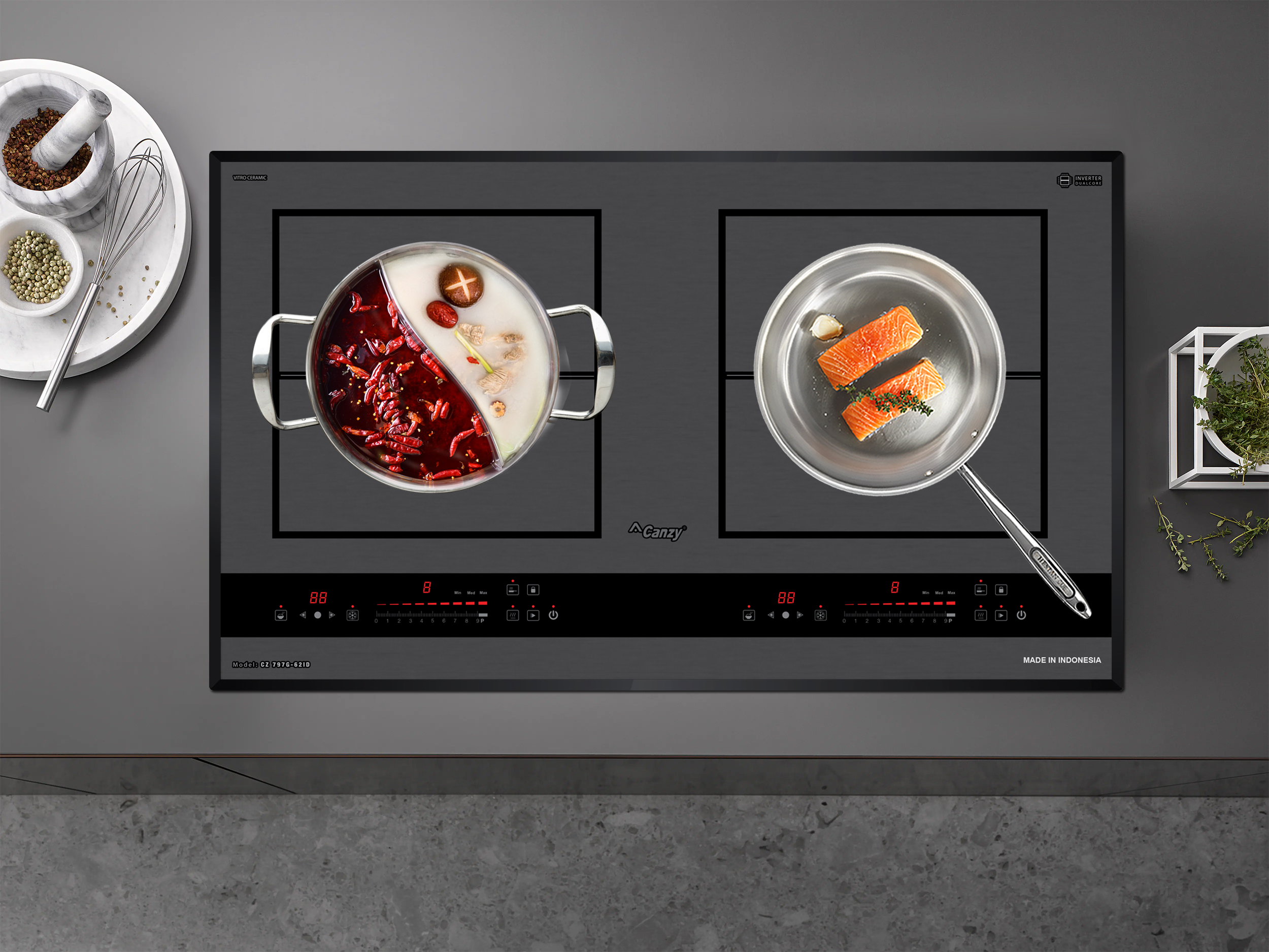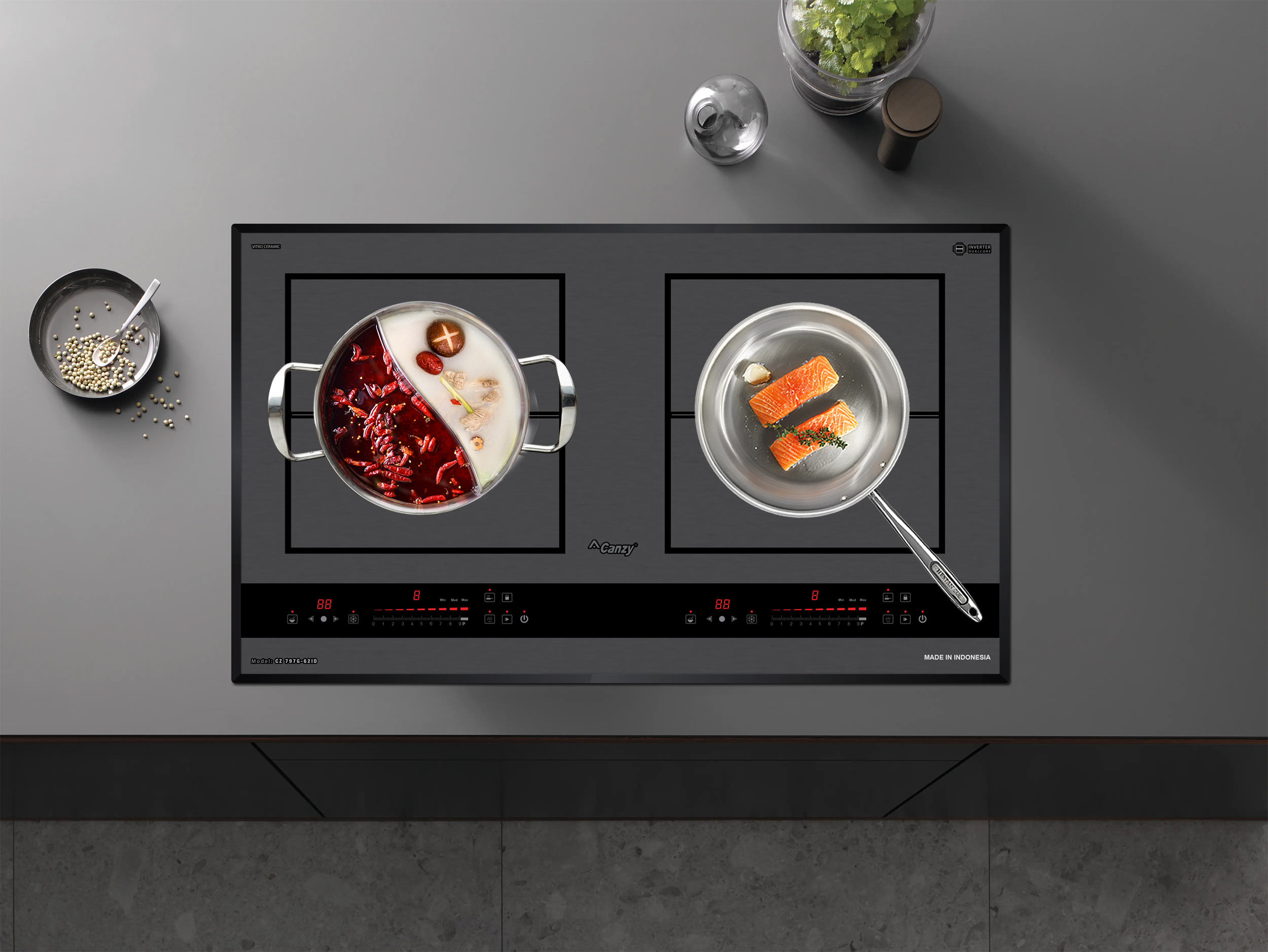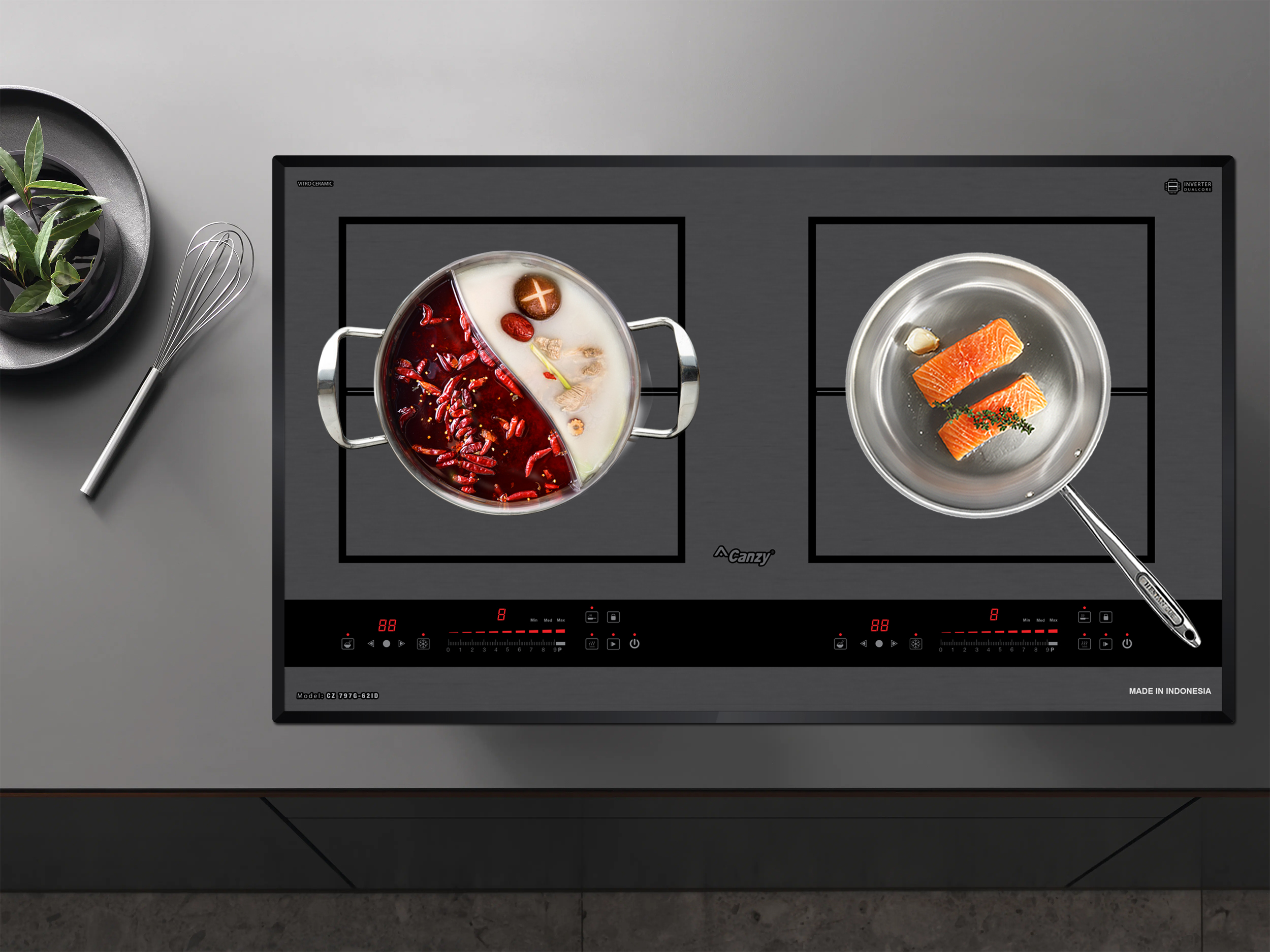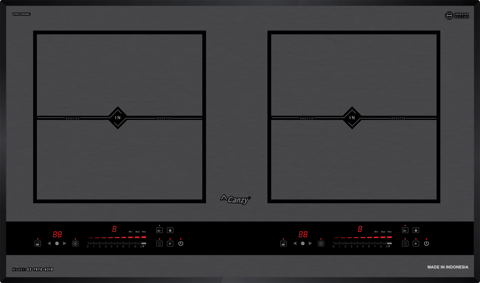 Bếp từ Canzy CZ 797G-62ID được tích hợp chức năng tự nhận diện vùng nấu, khi ta đặt nồi lên 1 trong 2 vùng nấu sau đó ấn nút khởi động bếp sau thời gian 1-2 giây bếp sẽ tự động tìm vùng nấu đã có nồi, ta chỉ việc điều chỉnh mức công suất to nhỏ theo ý muốn mà không phải thao tác chọn vùng nấu như bếp thông thường. Công nghệ Inverter được áp dụng trên bếp từ Canzy CZ 797G-62ID có khả năng phản ứng thay đổi công suất theo điều khiển ngay tức thì, khi người dùng điều chỉnh tăng giảm nhiệt độ đun nấu, bếp điều chỉnh thay đổi tức thì về mức nhiệt độ mong muốn.