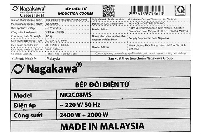 Sản phẩm thuộc thương hiệu bếp từ Nagakawa của Việt Nam, sản xuất tại Malaysia