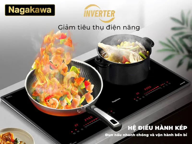 Chiếc bếp từ NK2C06MS được trang bị mặt kính Schott Ceran cao cấp loại gốm sứ thủy tinh rất thân thiện với môi trường. Mặt bếp có khả năng chịu được nồi có trọng lượng lên đến 15kg trên 1 vùng nấu. Mặt kính chịu nhiệt lên đến 1000°C, chịu sốc nhiệt 750°C. Ngoài ra, kính cũng chịu được lực tốt, chống trầy xước hiệu quả, dễ dàng vệ sinh đảm bảo sự bền đẹp sau thời gian dài sử dụng. Công nghệ Inverter tiết kiệm điệnỨng dụng công nghệ Inverter tiên tiến, bếp từ đôi Nagakawa NK2C06MS tiết kiệm điện hiệu quả nhờ kiểm soát công suất của thiết bị, nhằm tránh hao phí năng lượng trong quá trình sử dụng. Bên cạnh đó, bếp còn có khả năng gia nhiệt ổn định hơn so với bếp từ thông thường. Món chiên rán, ninh hầm của bạn được nấu trên bếp từ Nagakawa cũng trở nên ngon không kém so với nấu trên bếp ga, bếp lửa truyền thống. Hệ điều hành kép giúp bếp hoạt động bền bỉ, mạnh mẽMột trong những ưu điểm vượt trội của chiếc bếp từ đôi NK2C06MS này đó chính là hệ điều hành kép sử dụng 2 thanh công suất IGBT tạo thành cơ chế hoạt động thông minh. Các IGBT có thể hoạt động đồng thời giúp cho bếp có thể đạt công suất tối đa trong vòng vài giây hoặc hoạt động luân phiên theo lệnh điều hành từ trung tâm, kết hợp công nghệ biến tần giúp tiết kiệm năng lượng và đảm bảo tuổi thọ của bếp.