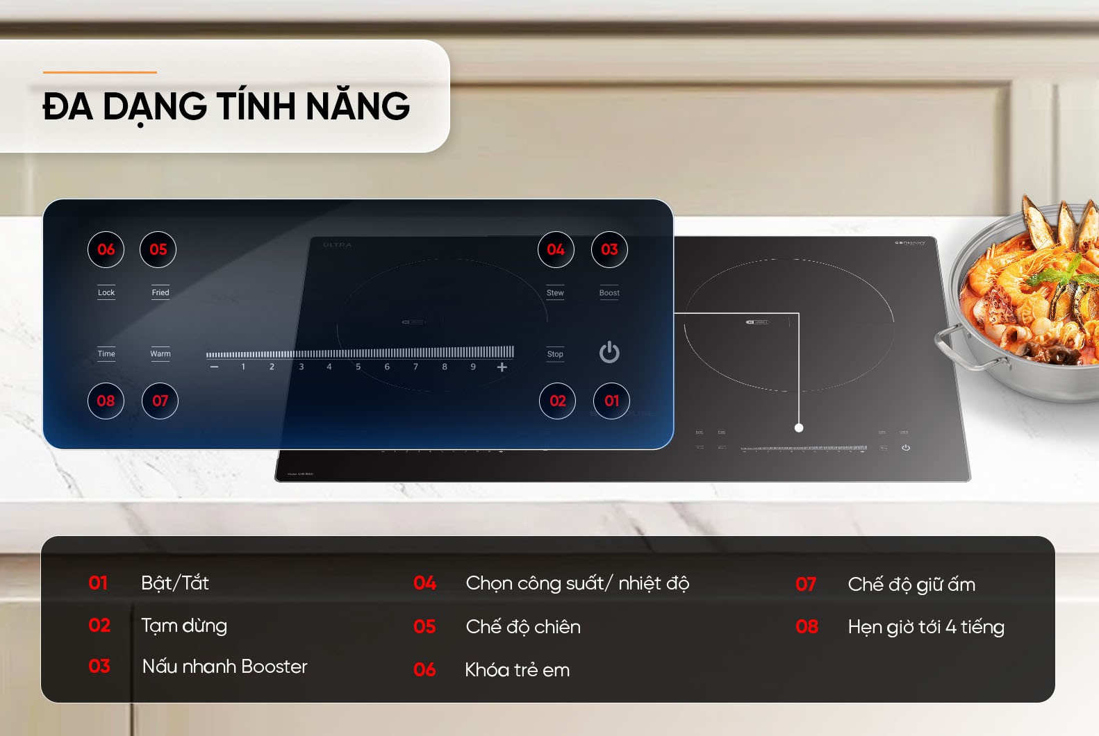 Chức năng nấu nhanh – BOOSTER giúp bếp đẩy lên mức công suất cực đại nhanh nhất, giúp gia nhiệt nhanh chóng và cho hiệu suất hoạt động lên đến 90% so với các bếp từ thông thường. Điều này giúp tiết kiệm thời gian và làm việc nhanh hơn trong bếp.