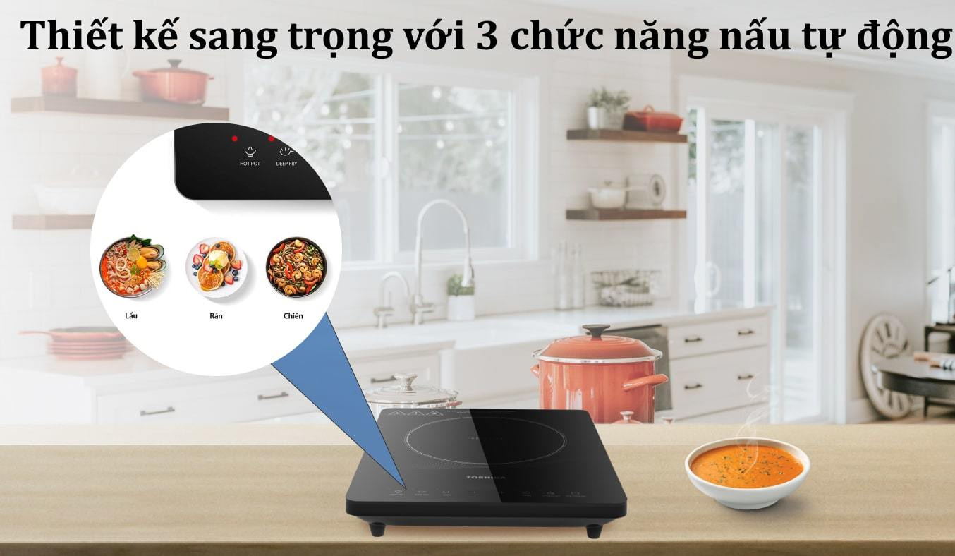 Bếp từ đơn Toshiba IC-20R1SV có thiết kế nhỏ gọn, không chiếm nhiều diện tích với gam màu đen hài hòa tô điểm cho không gian bếp thêm phần sang trọng. Đi kèm 3 chế độ nấu được cài đặt sẵn cho bạn thuận tiện chế biến nhiều món ăn ngon bao gồm: lẩu – chiên – rán. Ngoài ra, bếp từ Toshiba IC-20R1SV còn được trang bị tính năng hẹn giờ nấu lên đến 3 giờ cho bạn chủ động thời gian nấu nướng.