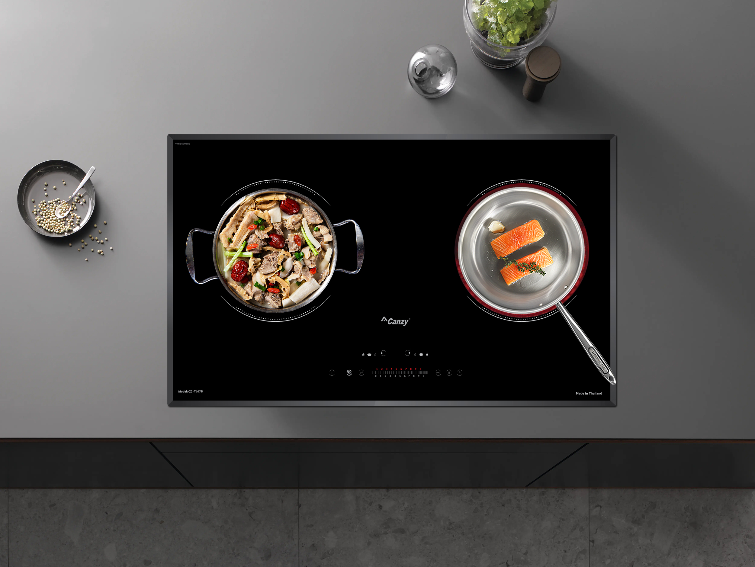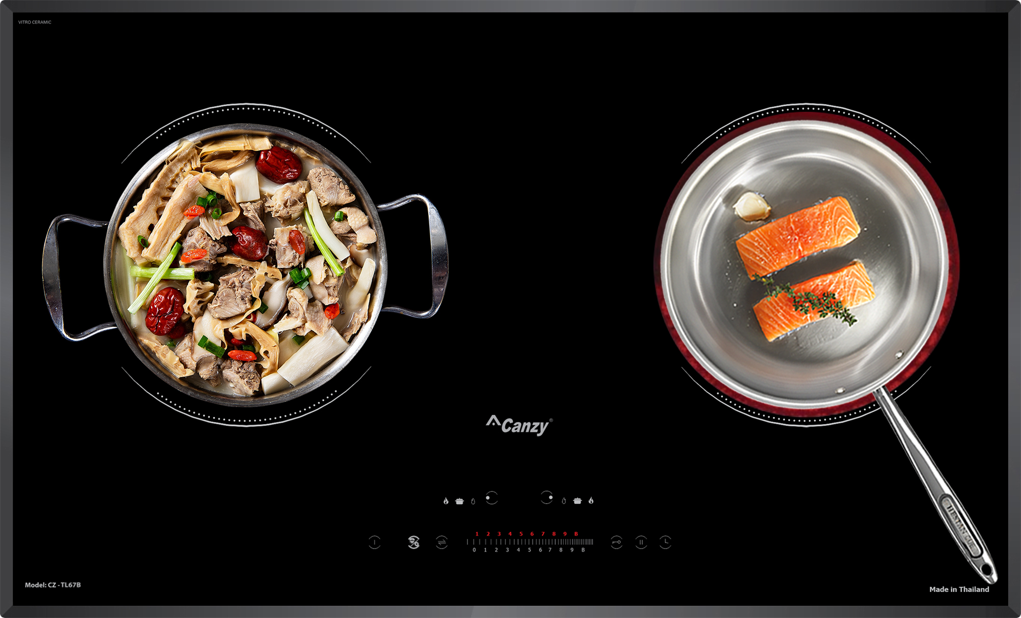 Tự động phát hiện vùng nấu và vùng nấu chỉ nóng lên khi có nồi: Các sản phẩm bếp điện từ của Canzy bao gồm CZ-TL67B sẽ chỉ khởi động công suất khi nồi được đặt lên vùng nấu, trường hợp chưa đặt nồi khi đã khởi động, bếp sẽ không đóng công suất và cảnh báo mã lỗi không có nồi hoặc nồi không phù hợp.