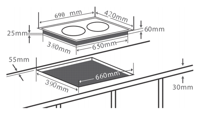 – Bếp phải được nối tiếp đất trước khi dùng. Không lắp đặt tủ lạnh, lò vi sóng, lò nướng, máy rửa chén phía dưới bếp.