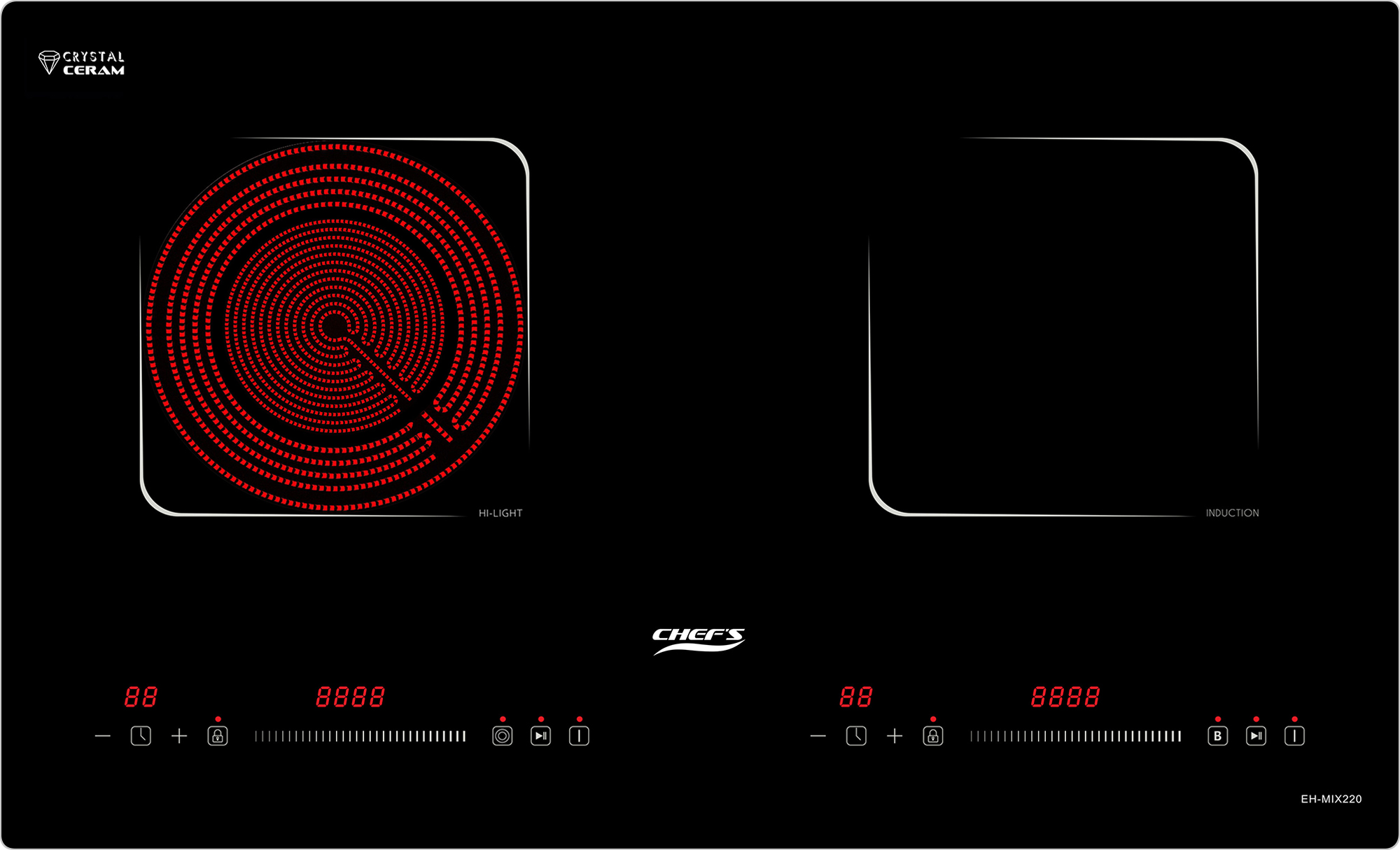 Bếp điện từ Chefs EH-MIX220 gồm 2 vùng nấu với tổng công suất là 4400W. Vùng nấu hồng ngoại trái trang bị mâm nhiệt E.G.O HI-LIGHT với 02 vòng nhiệt có công suất tối đa là 2200W. Vùng nấu từ phải công suất là 2000W có thể đạt mức công suất tối đa khi kích hoạt tính năng nấu nhanh Booster là 2200W. Chức năng Booster ở vùng từ nấu siêu nhanh, tuy nhiên thời gian tối đa mặc định dùng chức năng này là 10 phút/lần tránh quá tải.