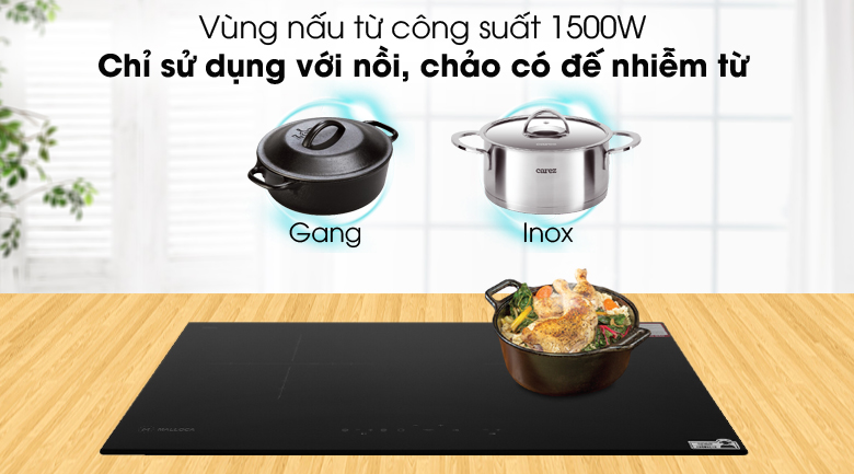 Lưu ý: nồi dùng bếp từ phải đạt tiêu chuẩn: nồi inox 3 đáy trở lên, đáy phải bằng phẳng, không rỗ tổ ong và phải có chất dẫn từ tốt.