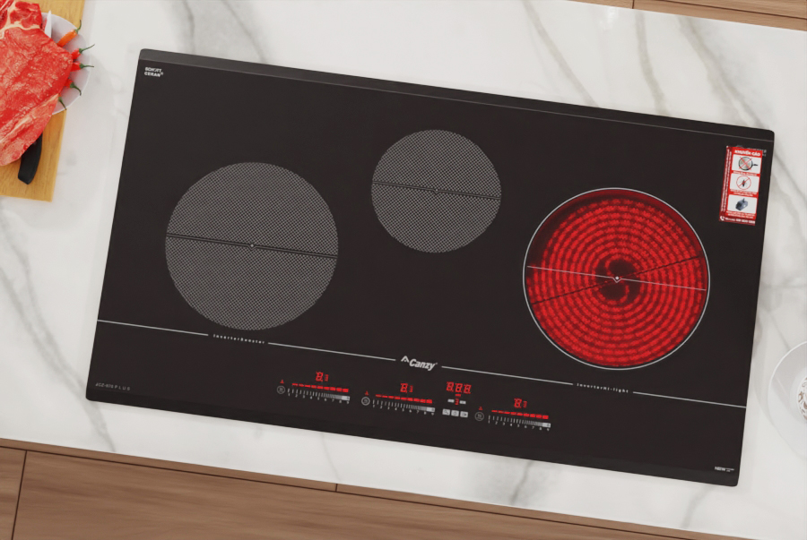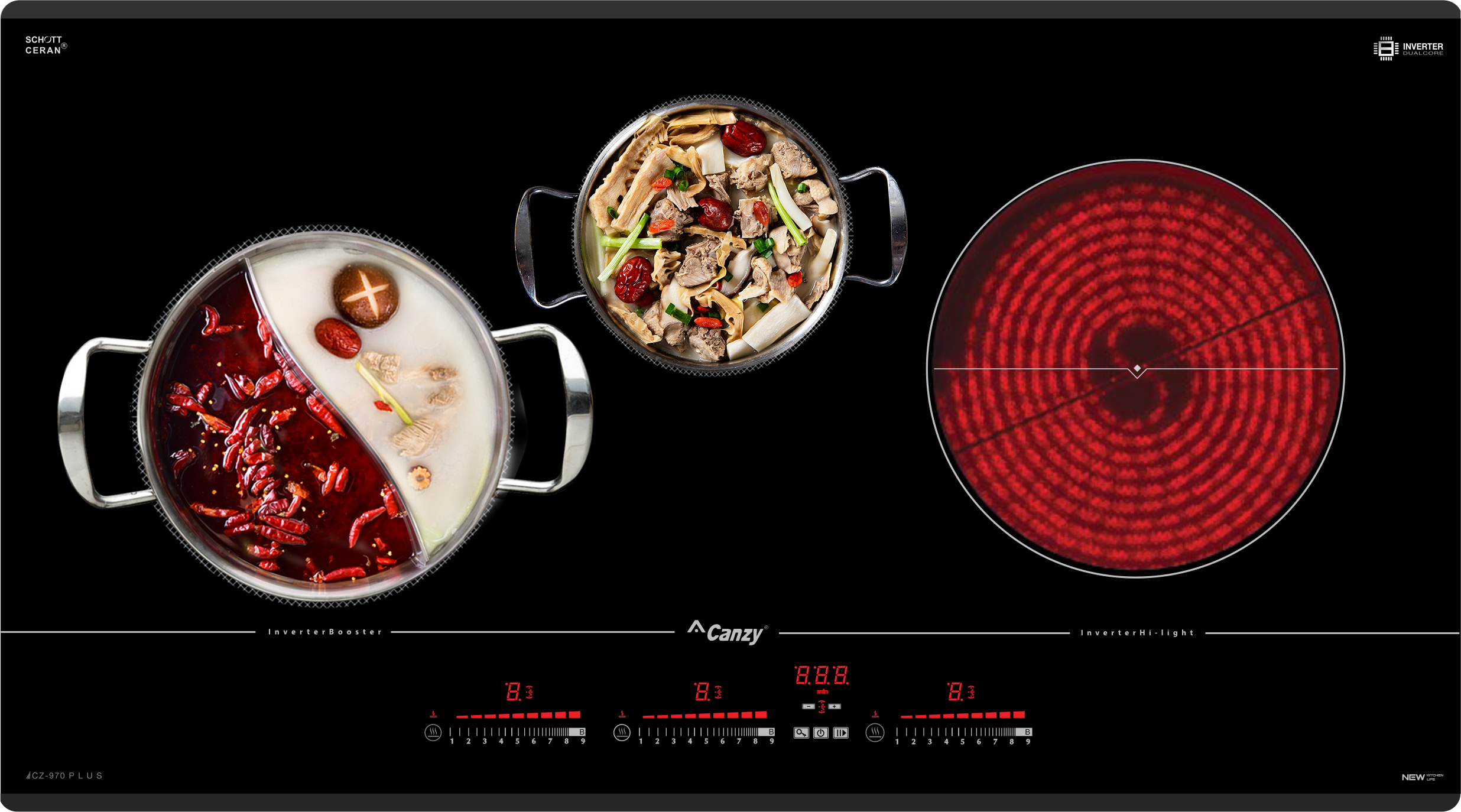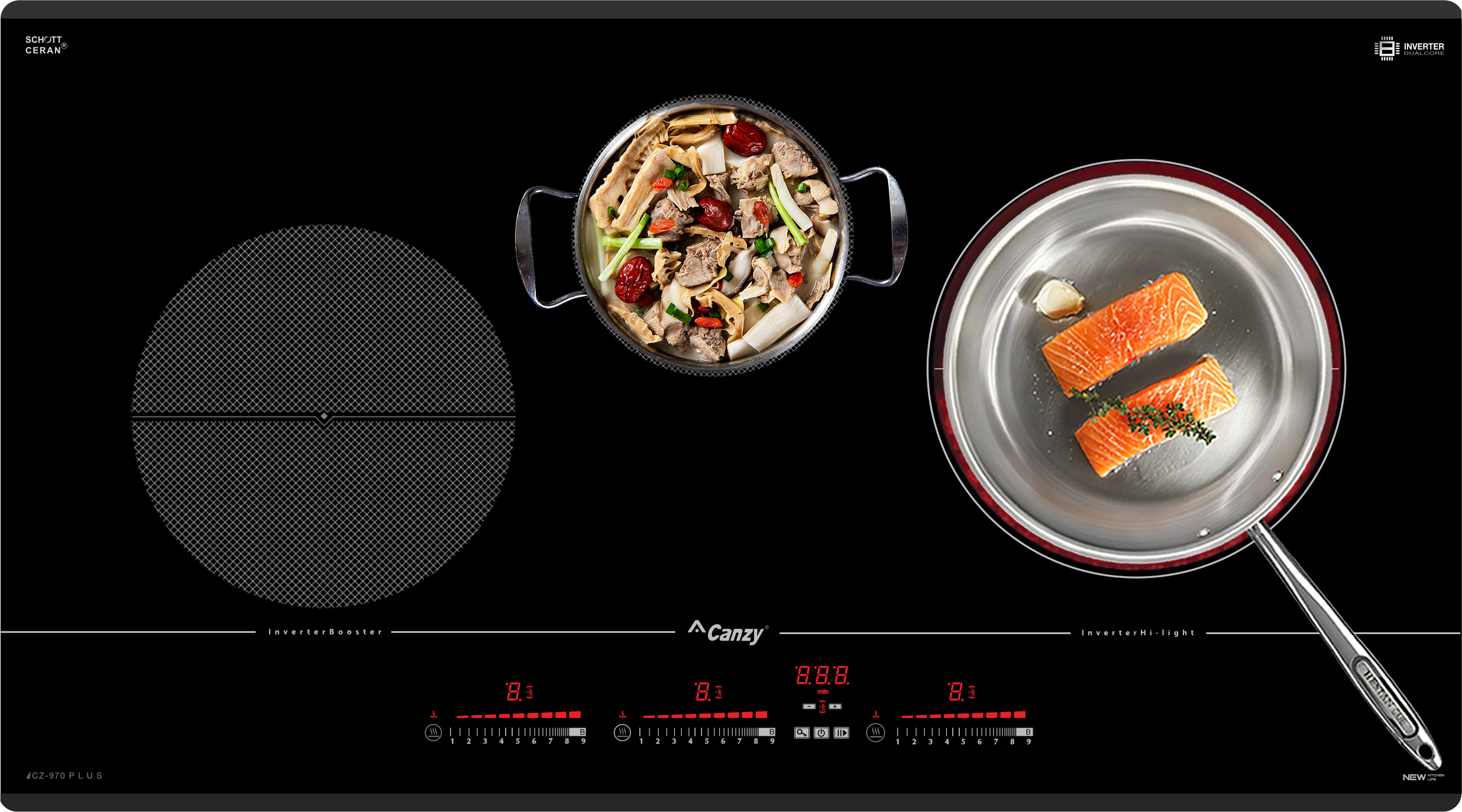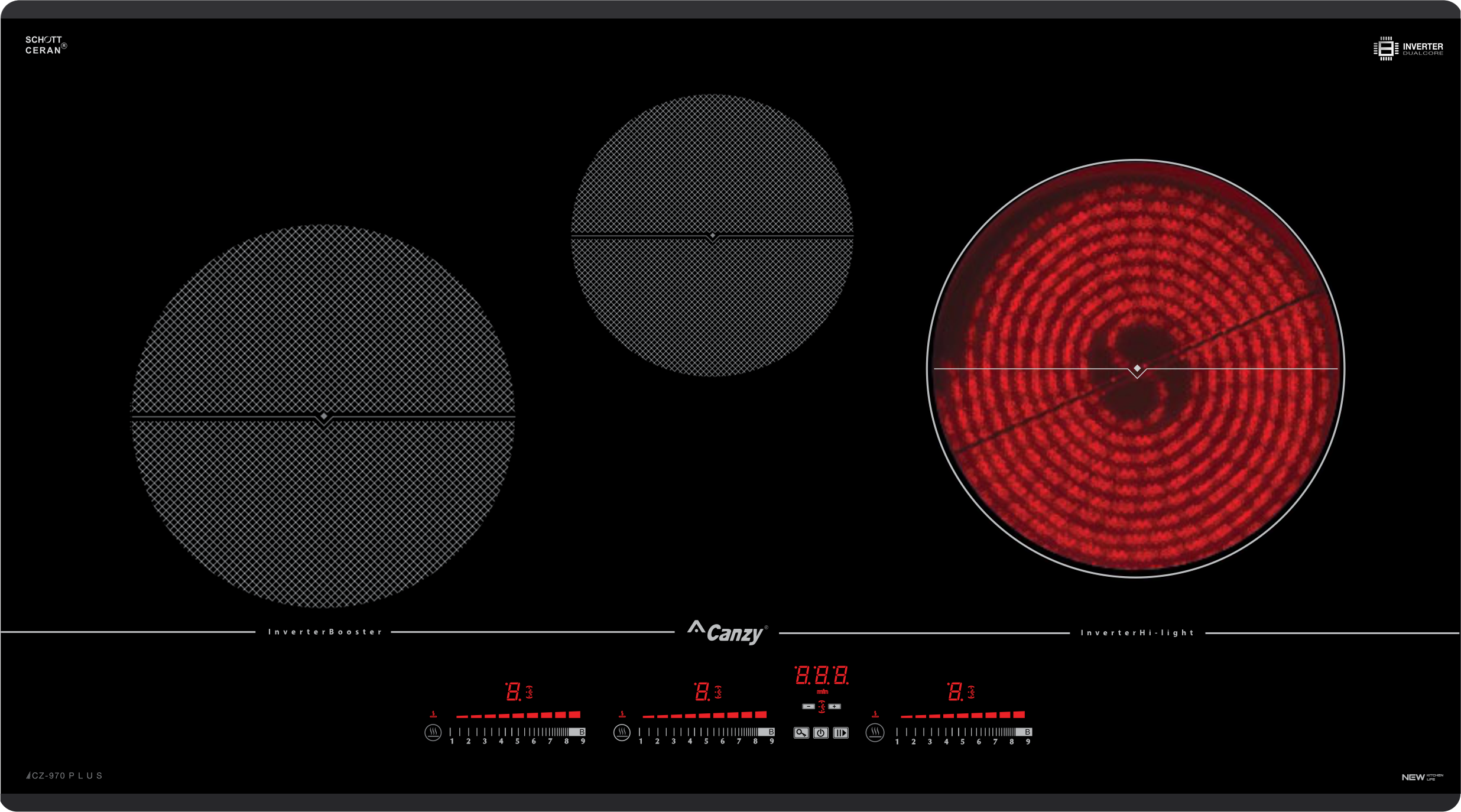 Bếp điện từ Canzy CZ-970 Plus gồm 3 vùng nấu với tổng công suất là 5900W. Vùng nấu từ trái với công suất là 2300W khi kích hoạt tính năng nấu siêu nhanh Booster công suất lên tới 3000W. Vùng nấu từ giữa với công suất là 1400W khi kích hoạt tính năng nấu siêu nhanh Booster công suất lên tới 2100W. Vùng nấu hồng ngoại phải trang bị mâm nhiệt E.G.O Hi-light 2 vòng nhiệt với công suất tối đa lên tới 2200W. Chức năng Booster nấu siêu nhanh, tuy nhiên thời gian tối đa mặc định dùng chức năng này là 10 phút/lần tránh quá tải.