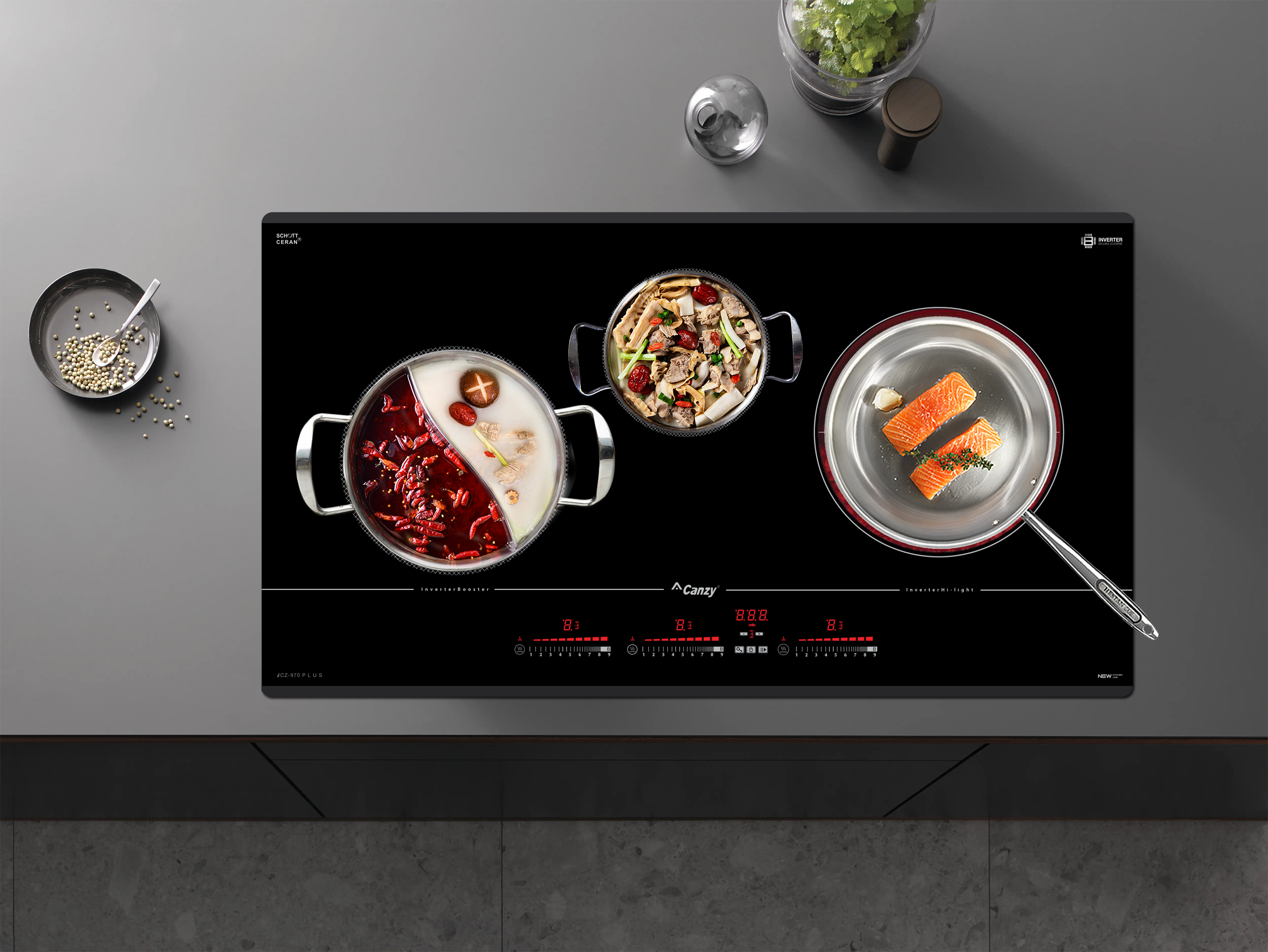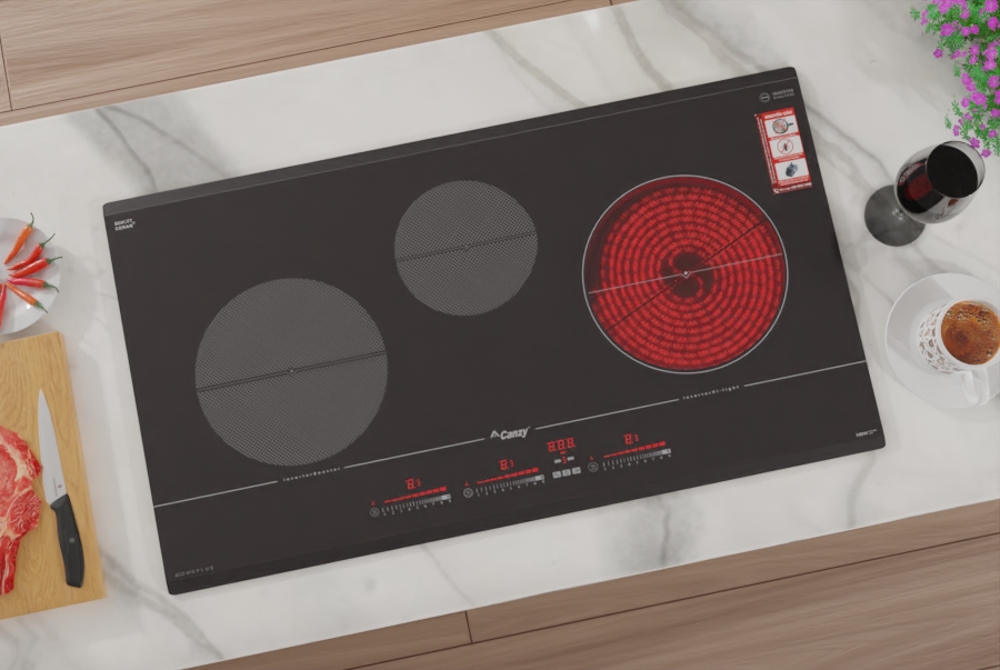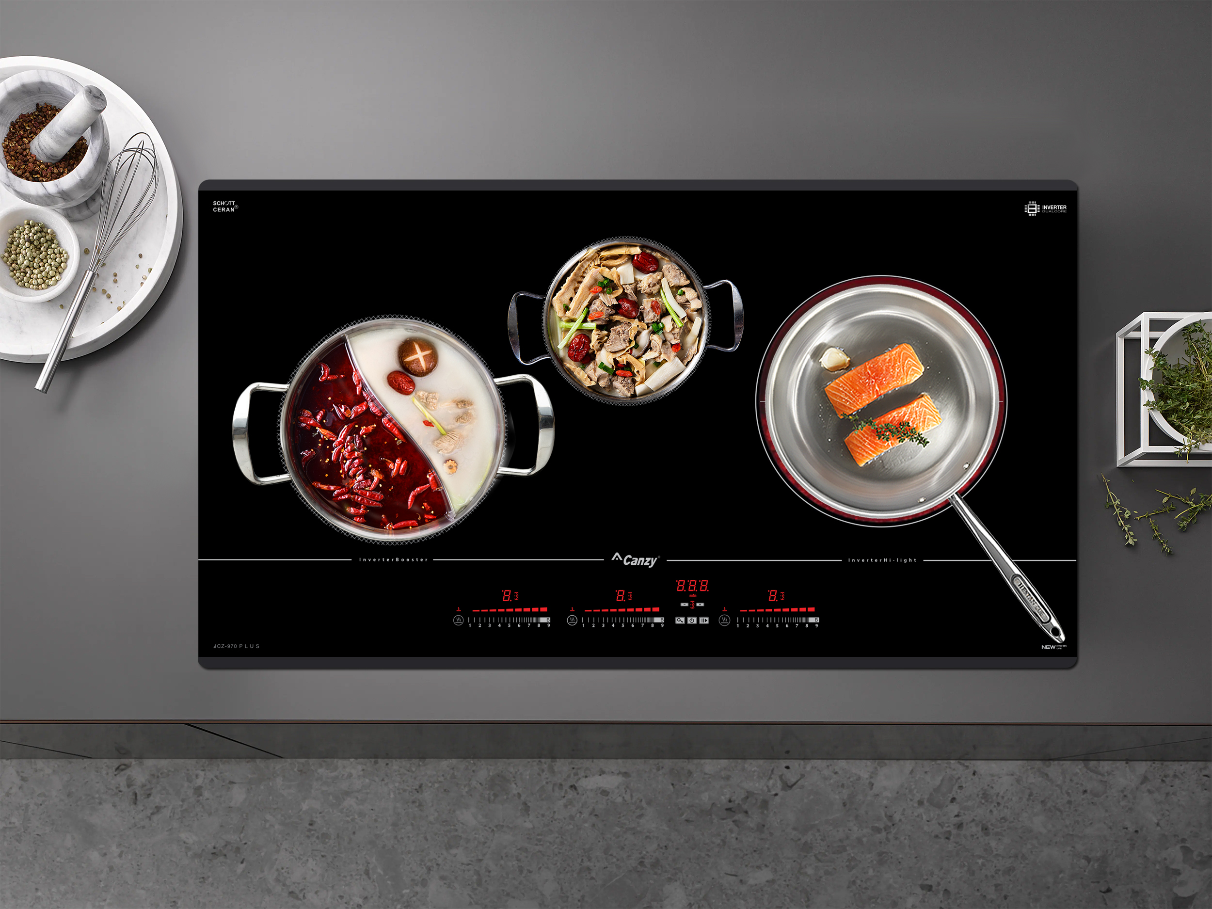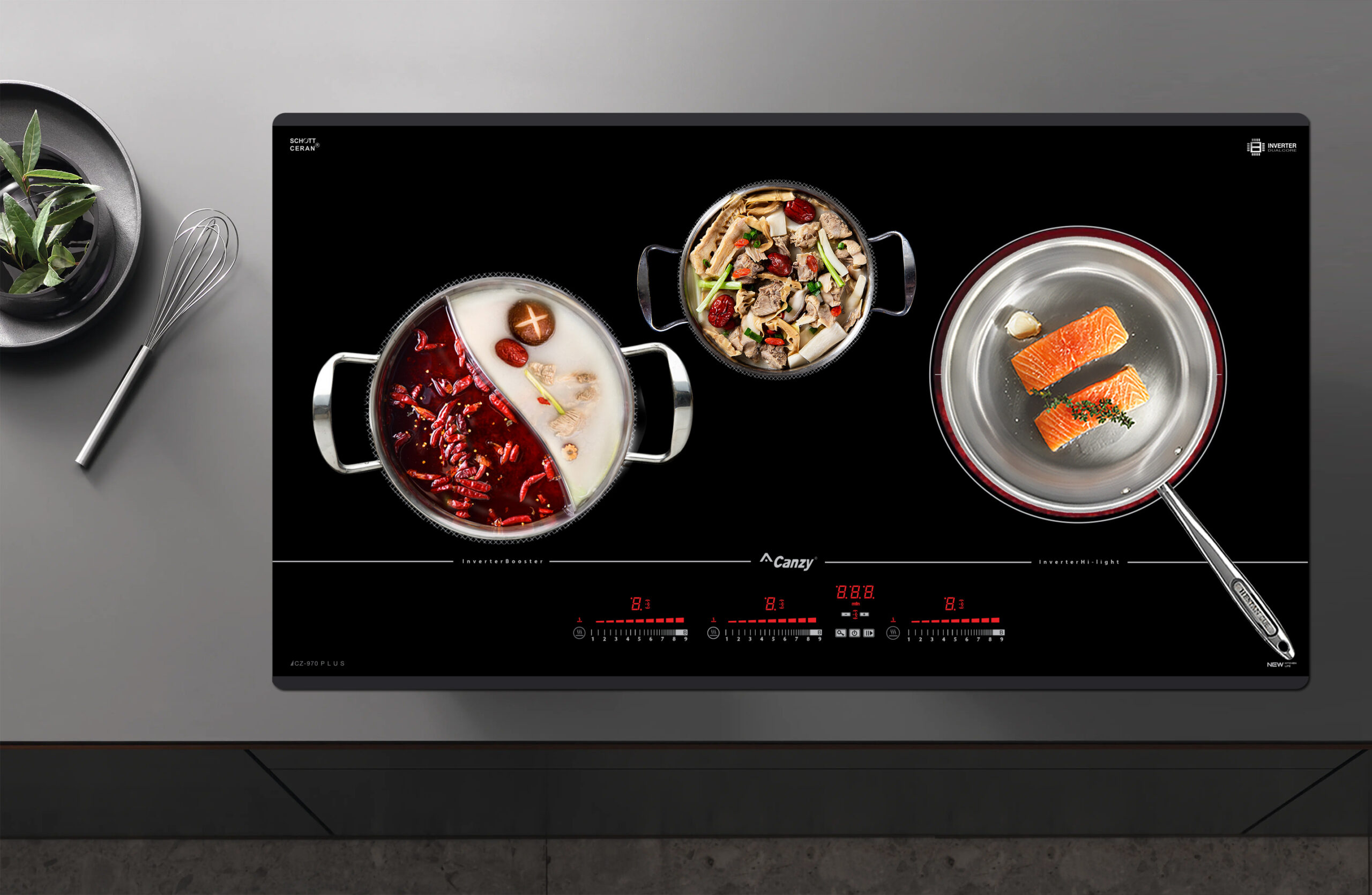 Bếp điện từ Canzy CZ-970 Plus gồm 3 vùng nấu với tổng công suất là 5900W. Vùng nấu từ trái với công suất là 2300W khi kích hoạt tính năng nấu siêu nhanh Booster công suất lên tới 3000W. Vùng nấu từ giữa với công suất là 1400W khi kích hoạt tính năng nấu siêu nhanh Booster công suất lên tới 2100W. Vùng nấu hồng ngoại phải trang bị mâm nhiệt E.G.O Hi-light 2 vòng nhiệt với công suất tối đa lên tới 2200W. Chức năng Booster nấu siêu nhanh, tuy nhiên thời gian tối đa mặc định dùng chức năng này là 10 phút/lần tránh quá tải.