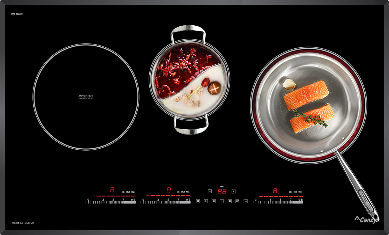 Bếp điện từ Canzy CZ-ML86GB được tích hợp chức năng tự nhận diện vùng nấu, khi ta đặt nồi lên 1 trong 2 vùng nấu từ sau đó ấn nút khởi động bếp sau thời gian 1-2 giây bếp sẽ tự động tìm vùng nấu đã có nồi, ta chỉ việc điều chỉnh mức công suất to nhỏ theo ý muốn mà không phải thao tác chọn vùng nấu như bếp thông thường. Công nghệ Half-Bridge Inverter được áp dụng trên bếp điện từ Canzy CZ-ML86GB có khả năng phản ứng thay đổi công suất theo điều khiển ngay tức thì, khi người dùng điều chỉnh tăng giảm nhiệt độ đun nấu, bếp điều chỉnh thay đổi tức thì về mức nhiệt độ mong muốn.