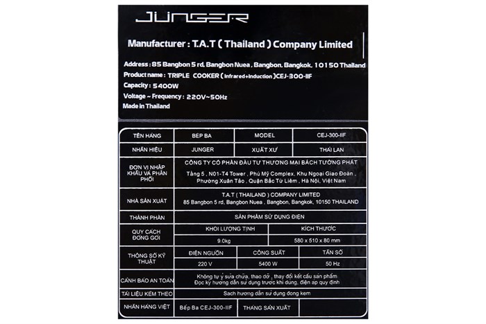 Bếp từ hồng ngoại ba vùng nấu Junger CEJ-300-IIF sản phẩm đun nấu sang trọng của thương hiệu Junger – Đức, sản xuất tại Thái Lan, thiết kế kết hợp bếp từ và bếp hồng ngoại, nấu ăn linh hoạt, an toàn, rất phù hợp cho ngôi nhà bạn.