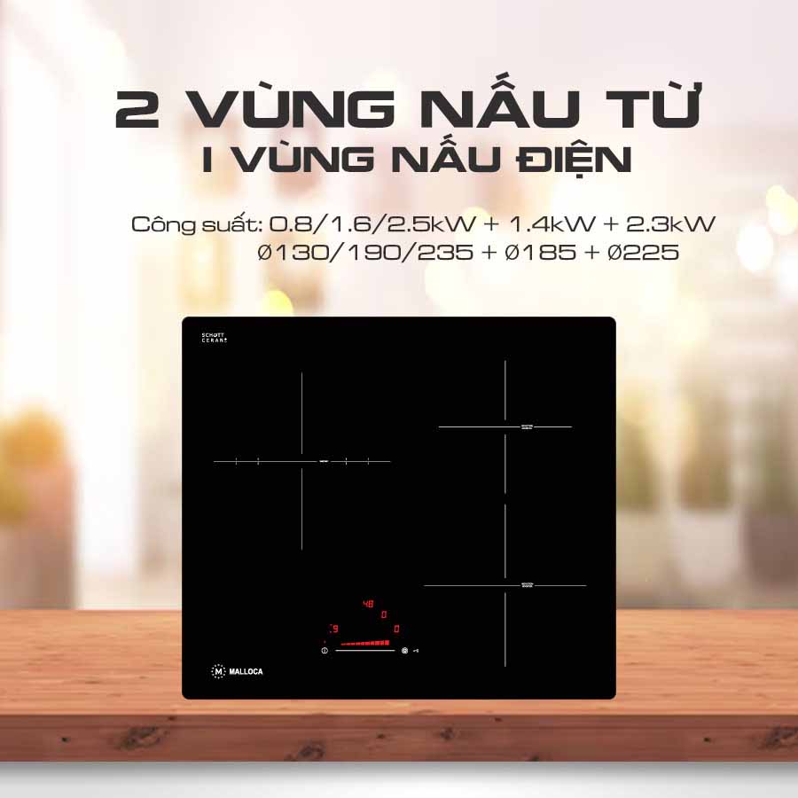 Bếp điện từ Malloca MIR 593 là sản phẩm bếp kết hợp 3 vùng nấu, gồm 2 vùng nấu từ và 1 vùng nấu điện (Hồng ngoại). Đây là mẫu bếp điện từ nhập khẩu Tây Ban Nha 3 vùng nấu bán chạy nhất của Malloca, được các khách hàng đánh giá cao.