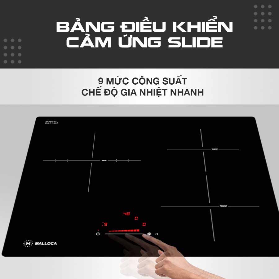 Bếp điện từ Malloca MIR 593 là mẫu bếp nhập khẩu Tây Ban Nha của Malloca. Bếp thiết kế kiểu vuông, Bảng điều khiển dạng Led, sử dụng chung cho 3 vùng nấu giúp điều khiển dễ dàng điều chỉnh mức công suất phù hợp giúp nấu các món ăn ngon hơn. Bếp có các tính năng hiện đại như Điều khiển dạng Slide (Dạng trượt), Booster (Nấu nhanh), Nhận diện vùng nấu, Cảnh báo chống tràn, Cảnh báo dư nhiệt.