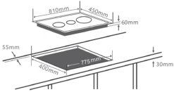 EH-MIX544P thiết kế 2 vùng nấu từ và 1 vùng nấu hồng ngoại phân bố dàn trải trên bề mặt kính. Vùng hồng ngoại ở vị trí ngoài cùng bên trái, sử dụng mâm nhiệt E.G.O với 2 vòng nhiệt (14/22cm), công suất 1900W.