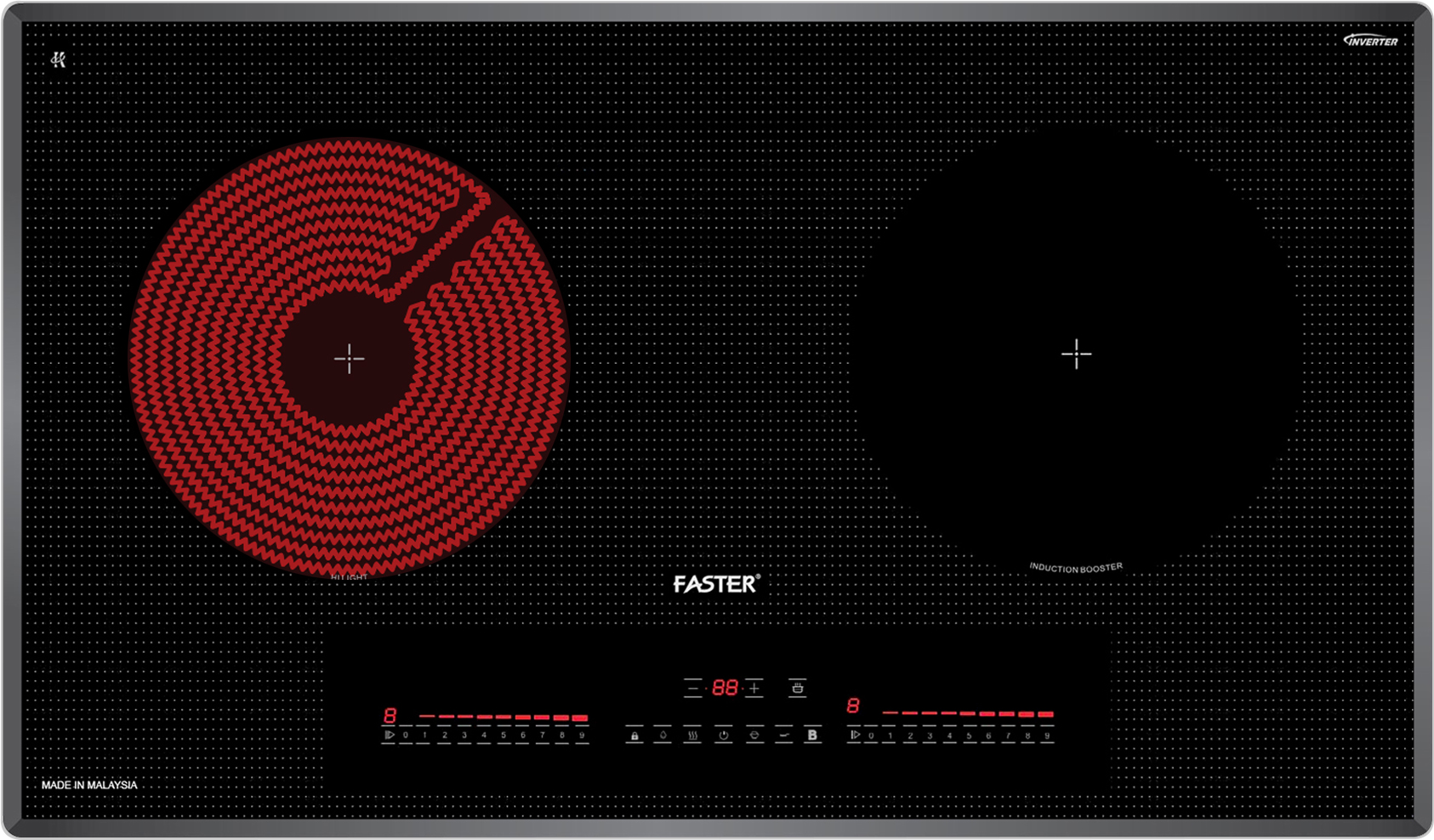 Bếp điện từ Faster FS 828HI gồm 2 vùng nấu với tổng công suất 4500W. Vùng nấu hồng ngoại trái trang bị mâm nhiệt Hi-Light với 02 vòng nhiệt cùng công suất lần lượt là 1100W và 2200W. Vùng nấu từ phải có công suất 2300W khi kích hoạt tính năng nấu siêu nhanh Booster công suất lên tới 3000W. Chỉ trong chốc lát sau khi kích hoạt tính năng này, nhiệt lượng trên vùng nấu từ tăng lên công suất tương đương với mức nhiệt lượng lớn nhất. Do đó, các món ăn được nấu chín nhanh hơn, tiết kiệm thời gian vào bếp cho chị em nội trợ.