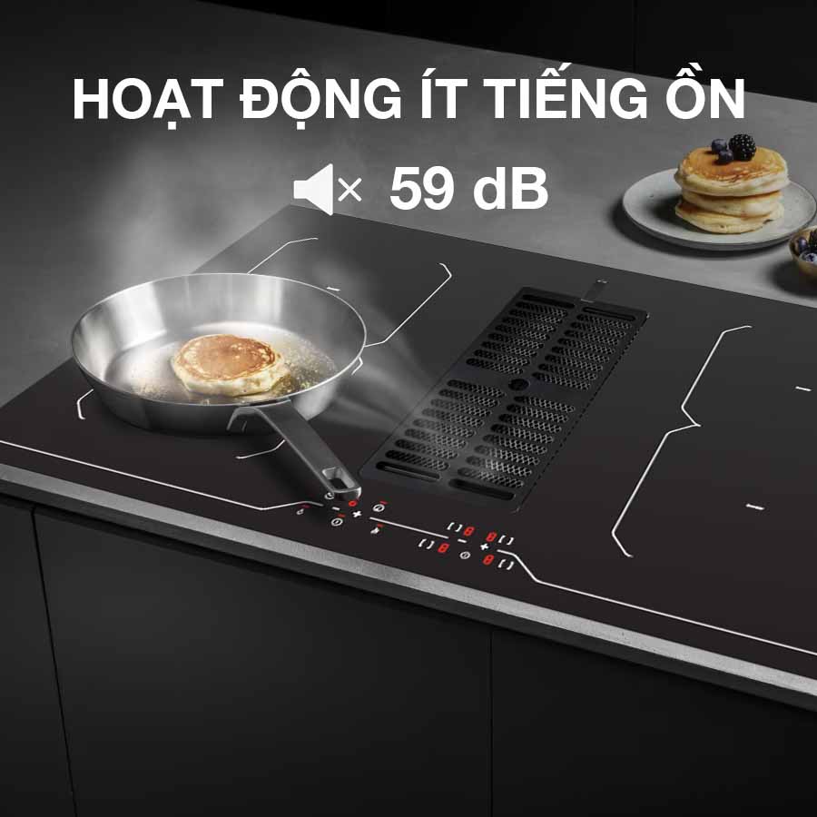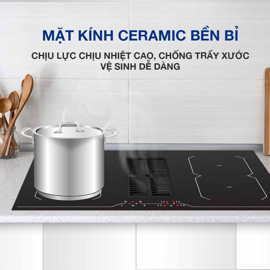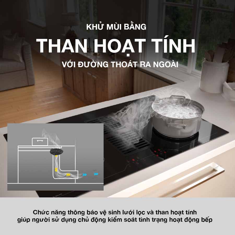 Bếp từ kết hợp máy hút mùi được thiết kế lắp âm với mặt kính mỏng tinh tế, sắc đen trung tính tạo sự hiện đại sang trọng, dễ phối hợp với các thiết bị bếp khác. Đặc biệt, với kiểu thiết kế này có khả năng tiết kiệm diện tích bếp hiệu quả, tạo nên chiều sâu cho không gian bếp.
