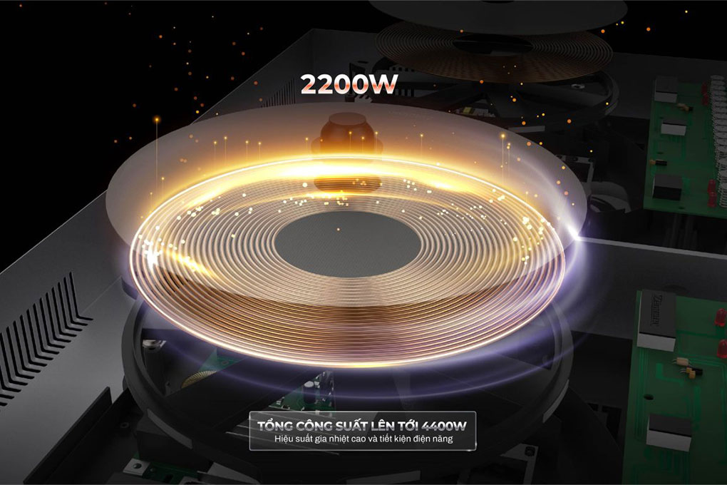 Với tổng công suất lên tới 5.6kW, bếp từ cho phép đun nấu nhanh chóng, đáp ứng được nhu cầu của cả những bữa ăn lớn. Chức năng Power Booster cung cấp mức công suất cực đại 4.400W trên cả hai vùng nấu giúp rút ngắn thời gian nấu nướng đáng kể. Hệ thống mâm từ thế hệ mới với kích thước 21cm tương thích với nhiều loại nồi chảo, tối ưu hóa hiệu quả sử dụng năng lượng.