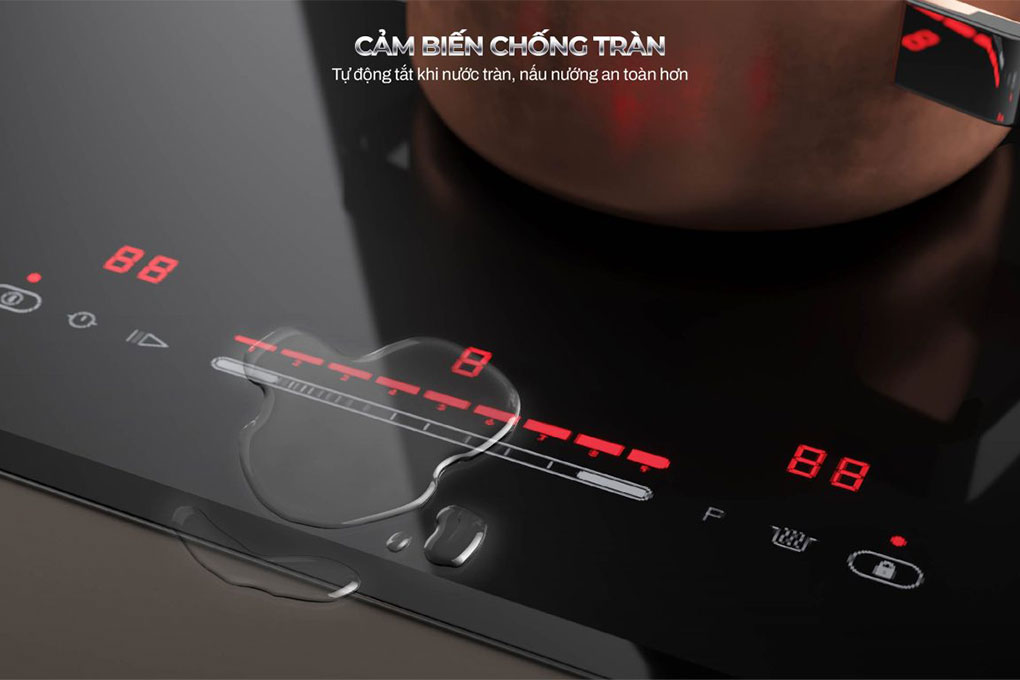 - Cảm biến chống tràn tự động phát hiện khi nước tràn ra bảng điều khiển và ngắt vùng nấu để bảo vệ an toàn cho người dùng.