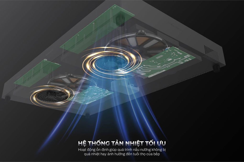 Hệ thống tản nhiệt kép gồm quạt và lá nhôm giúp làm mát bếp nhanh chóng, duy trì nhiệt độ ổn định cho các linh kiện bên trong. Nhờ vậy, tuổi thọ sản phẩm được nâng cao, vận hành bền bỉ. Mặt kính EuroK với bề mặt trơn nhẵn giúp vệ sinh bếp trở nên đơn giản, tiết kiệm thời gian và công sức sau mỗi lần nấu.