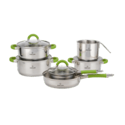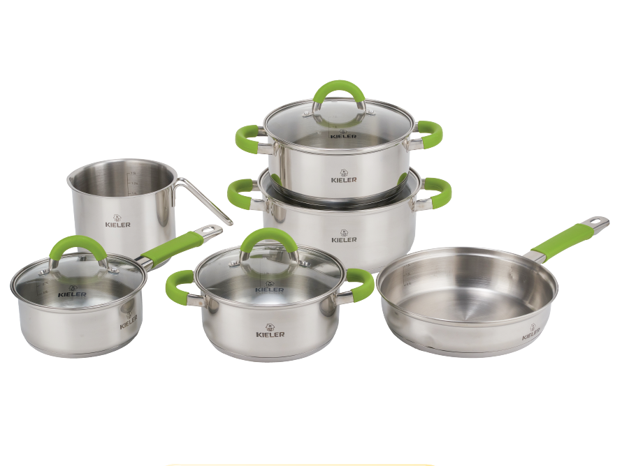 Bộ nồi Kieler RW-1003 sở hữu gam màu bạc và cách điện thêm quai cầm màu xanh để tạo điểm nhấn.