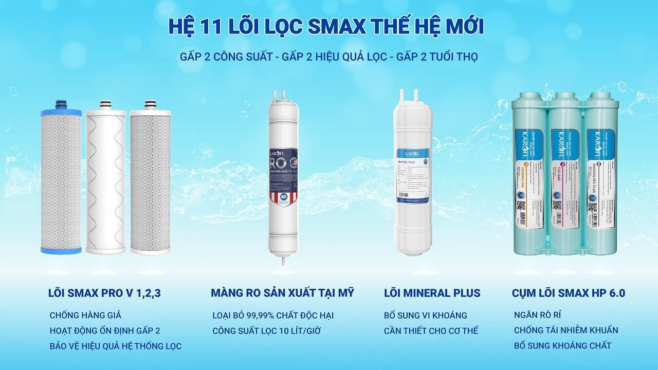 Máy lọc nước nóng nguội KAH-D15 sở hữu 11 lõi lọc Smax thế hệ mới: Gấp 2 công suất, gấp 2 hiệu quả lọc, gấp 2 tuổi thọ.