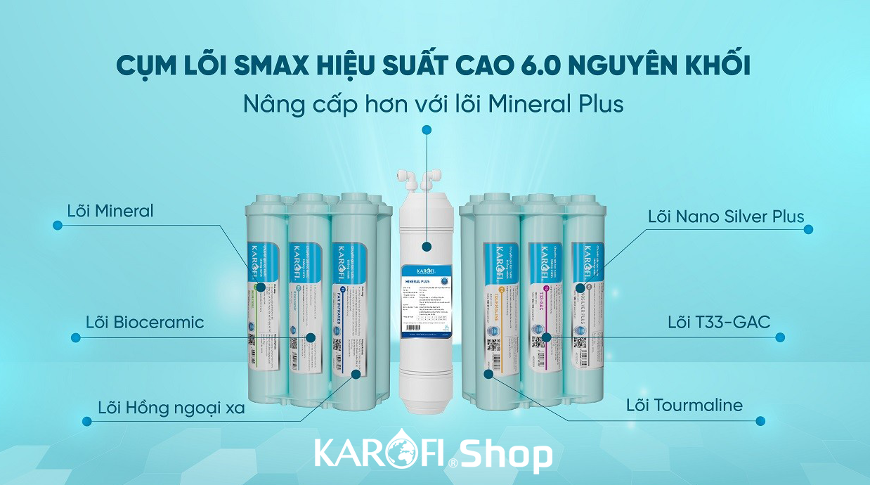 Hệ lõi lọc chức năng không chỉ được thiết kế nguyên khối hiện đại, ngăn ngừa rò rỉ tối đa và thay thế dễ dàng mà còn gấp đôi khoáng chất, nâng cấp và bảo vệ sức khỏe toàn diện cho cả gia đình. Bổ sung thêm lõi Mineral Plus cung cấp nhiều khoáng chất cần thiết (Ca, K+, Na+, Mg…), nâng cao PH, giúp trung hòa axit dư làm cơ thể khỏe hơn.