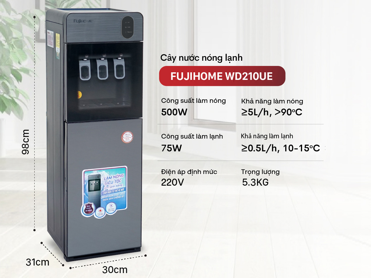 Sản phẩm phù hợp cho nhiều không gian khác nhau, từ gia đình, văn phòng đến các khu vực bếp hoặc phòng họp. Thiết kế tinh tế cùng các tính năng đa dạng giúp Fujihome WD210UE trở thành sự lựa chọn lý tưởng cho những ai đang tìm kiếm một thiết bị cung cấp nước nóng, lạnh tiện lợi và thẩm mỹ.