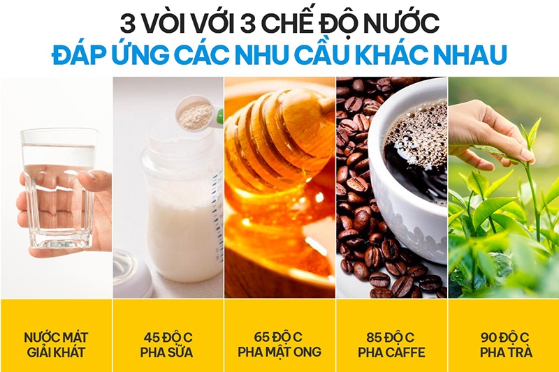 Nước nóng với nhiệt độ lên đến 90°C phù hợp để pha trà, pha sữa hay cà phê tức thì. Nước lạnh dao động trong khoảng 10 – 15°C mang lại cảm giác sảng khoái, đặc biệt trong những ngày nắng nóng. Ngoài ra, chế độ nước nguội giúp người dùng có thêm sự lựa chọn để uống trực tiếp hoặc sử dụng trong nấu ăn, pha chế hàng ngày. Thông qua đèn LED báo trạng thái, bạn dễ dàng quan sát chế độ nước đang được kích hoạt.