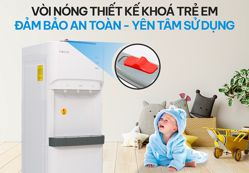 Để đảm bảo an toàn cho người dùng, đặc biệt là trong các gia đình có trẻ nhỏ, cây nước nóng lạnh hút bình Fujihome WD606ES được tích hợp tính năng khóa vòi nước nóng thông minh. Cơ chế khóa dạng gạt giúp ngăn ngừa tình trạng vô tình chạm vào vòi nóng, hạn chế tối đa nguy cơ bị bỏng trong quá trình sử dụng. Tính năng này cho thấy sự tinh tế trong thiết kế sản phẩm, khi không chỉ chú trọng đến hiệu năng mà còn đặt sự an toàn của người dùng lên hàng đầu.