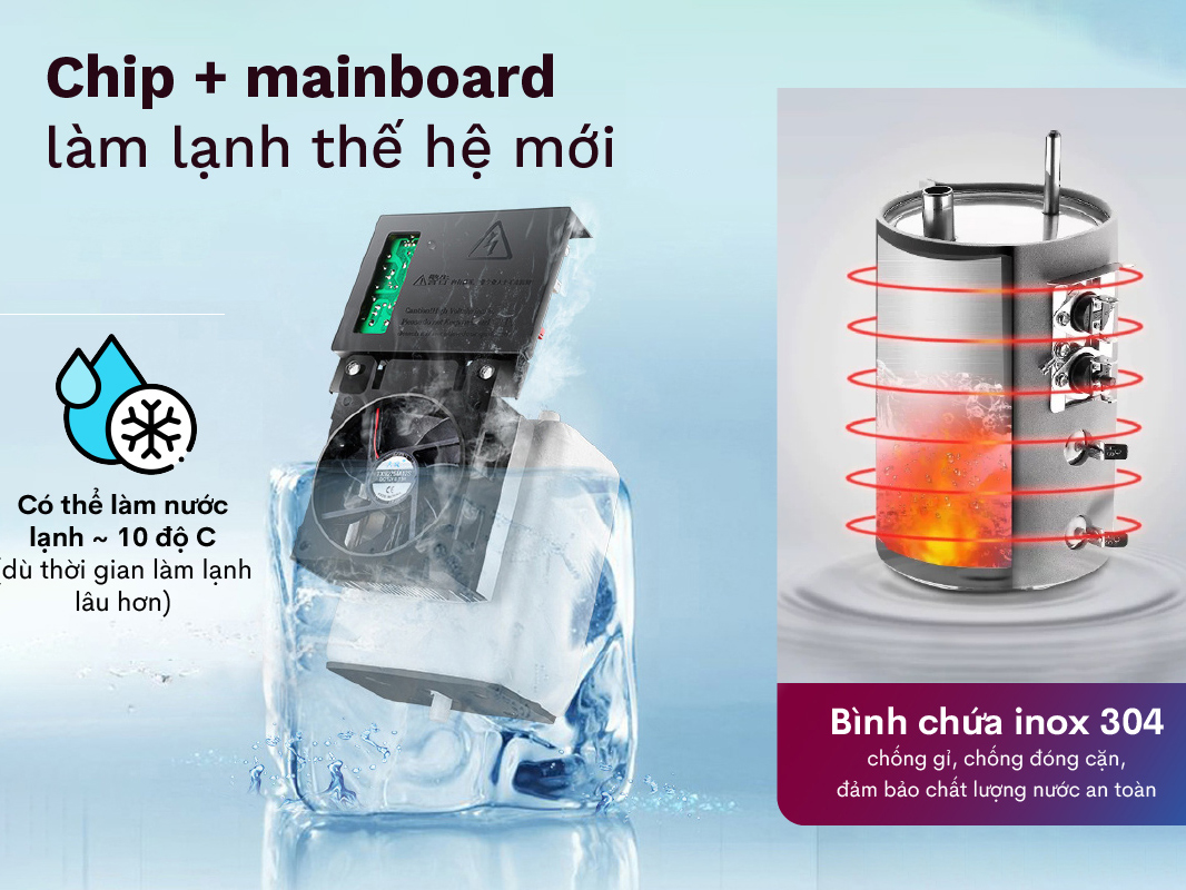 Cây nước nóng lạnh sử dụng hệ thống chip + mainboard làm lạnh mới cho phép làm lạnh tốt hơn các mã chip điện tử khác trên thị trường hiện nay.