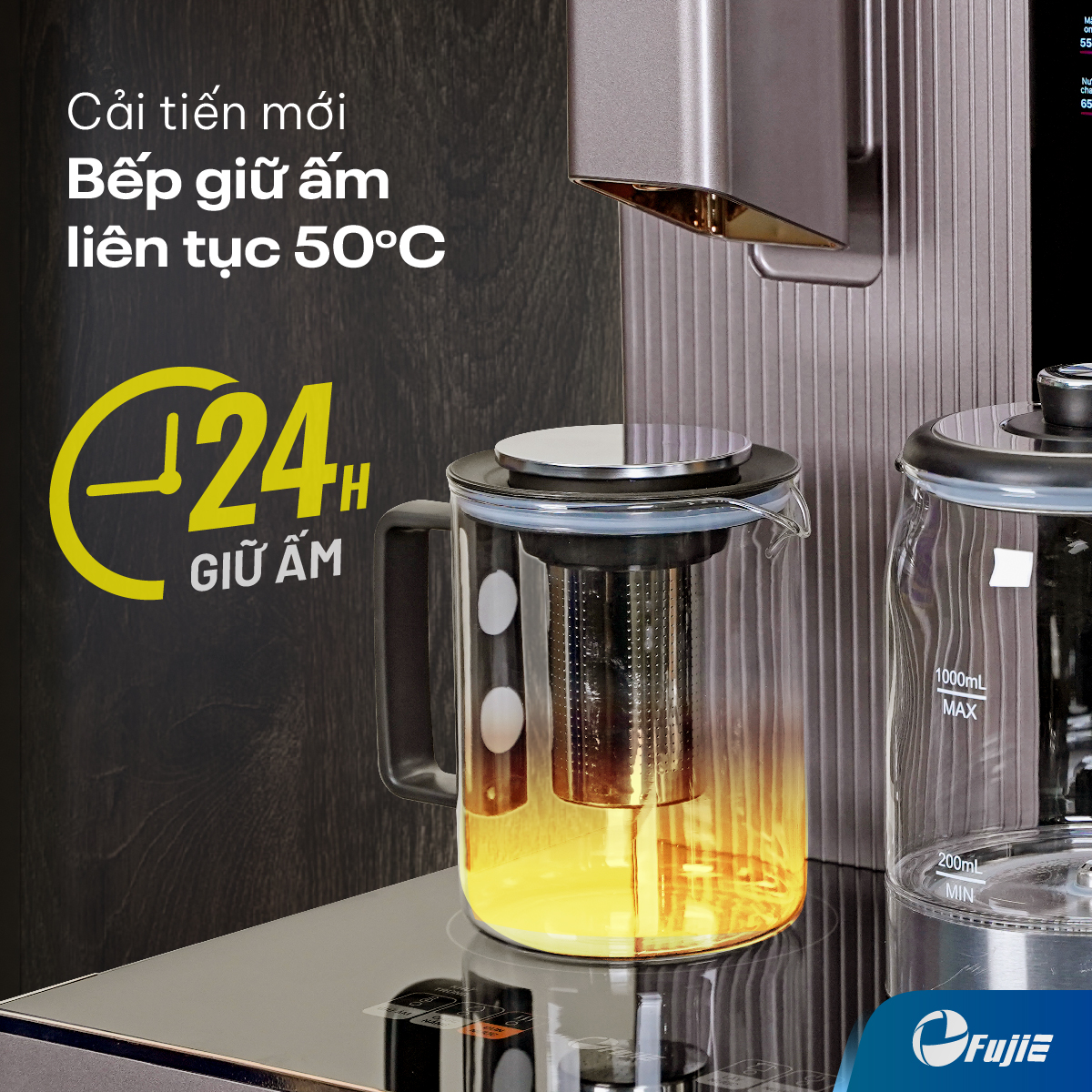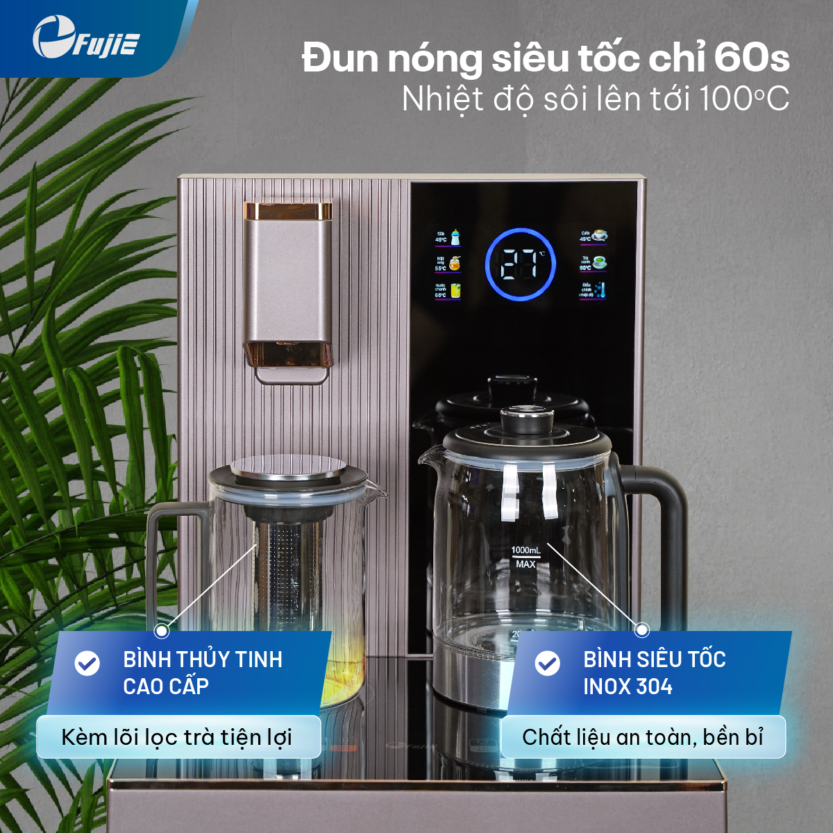 Sở hữu tông màu cà phê kết hợp viền mạ vàng thời thượng, FujiE TB238UV là điểm nhấn nổi bật cho mọi không gian. Mặt trên bằng kính cường lực bóng mờ, bảng điều khiển cảm ứng một chạm hiện đại với màn hình đa màu sắc, hiển thị menu nhiệt độ, chế độ nước và các tính năng cài đặt sẵn cho từng loại đồ uống như trà, cafe, nước sôi, nước ấm pha sữa…
