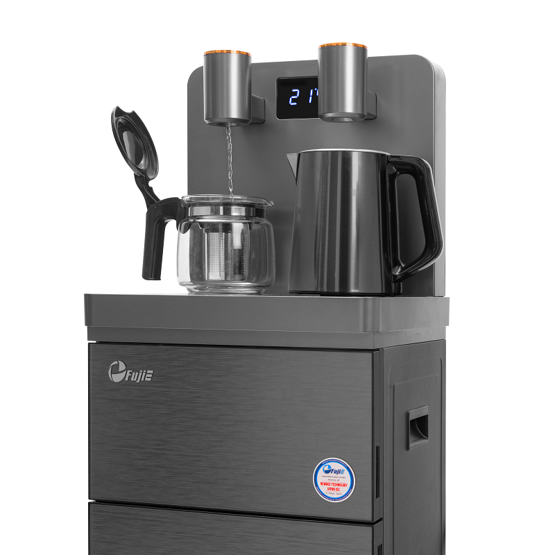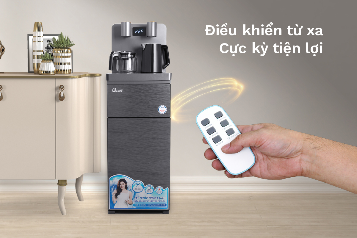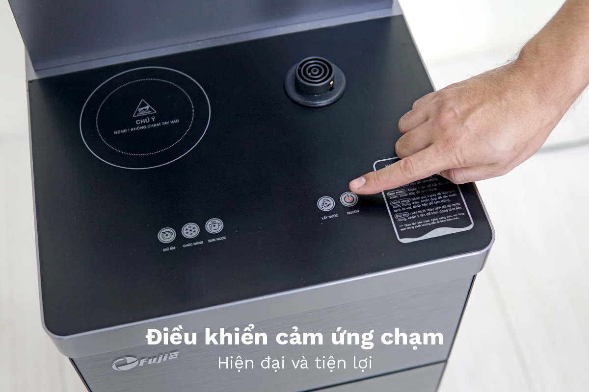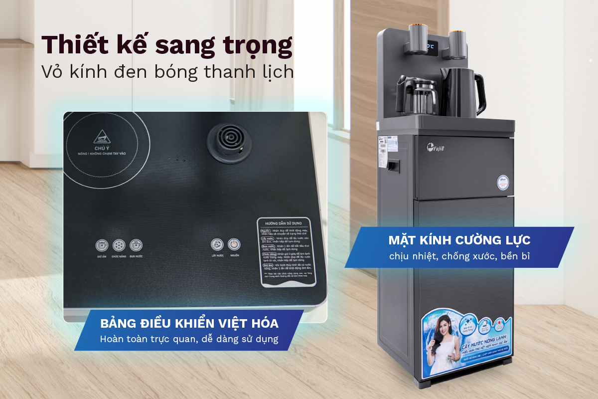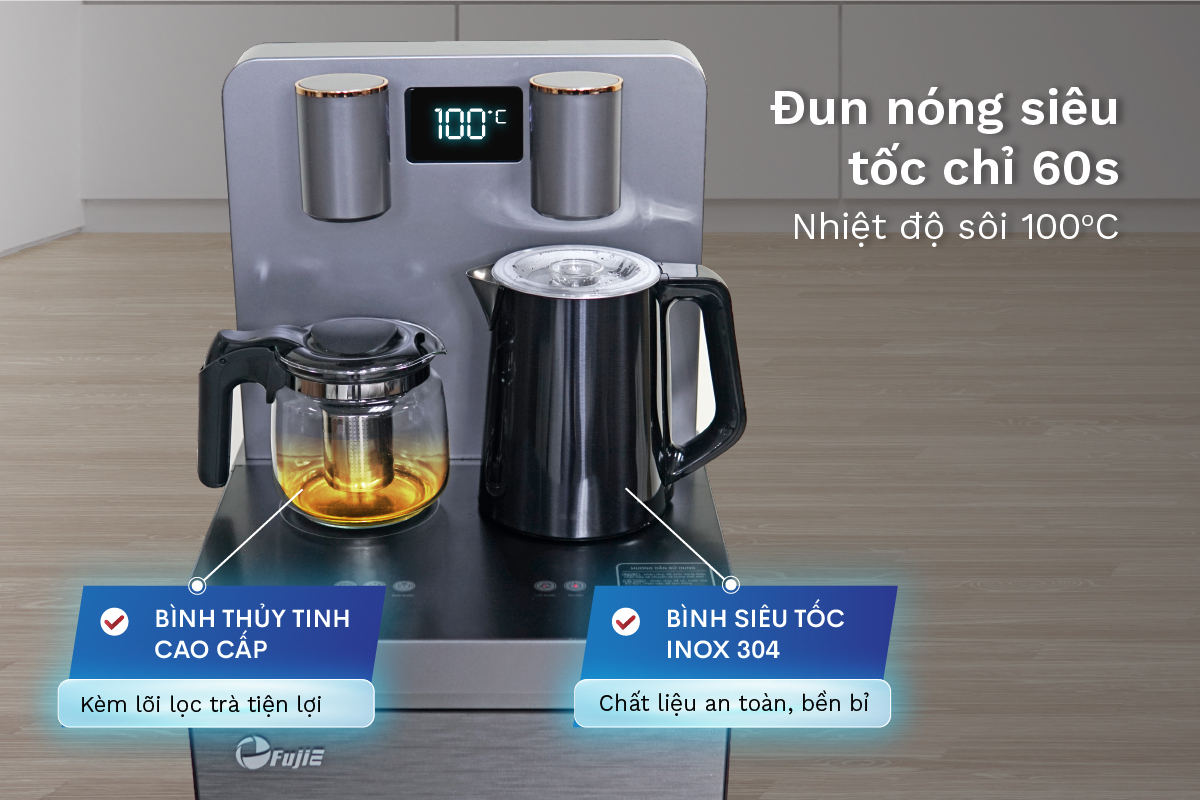 - Bình lọc nước đặt âm bên dưới tiện lợi cho việc thay bình. Nước lạnh được làm lạnh và lấy ra từ vòi trên cao thuận tiện bằng một thao tác nhẹ nhàng bấm nút . Bình siêu tốc lấy nước trực tiếp từ vòi có khả năng đun sôi nước tới 100 độ C cho nhiều mục đích sử dụng khác nhau. Bên trái có bình giữ nhiệt giúp hâm nóng trà, cafe tiện lợi