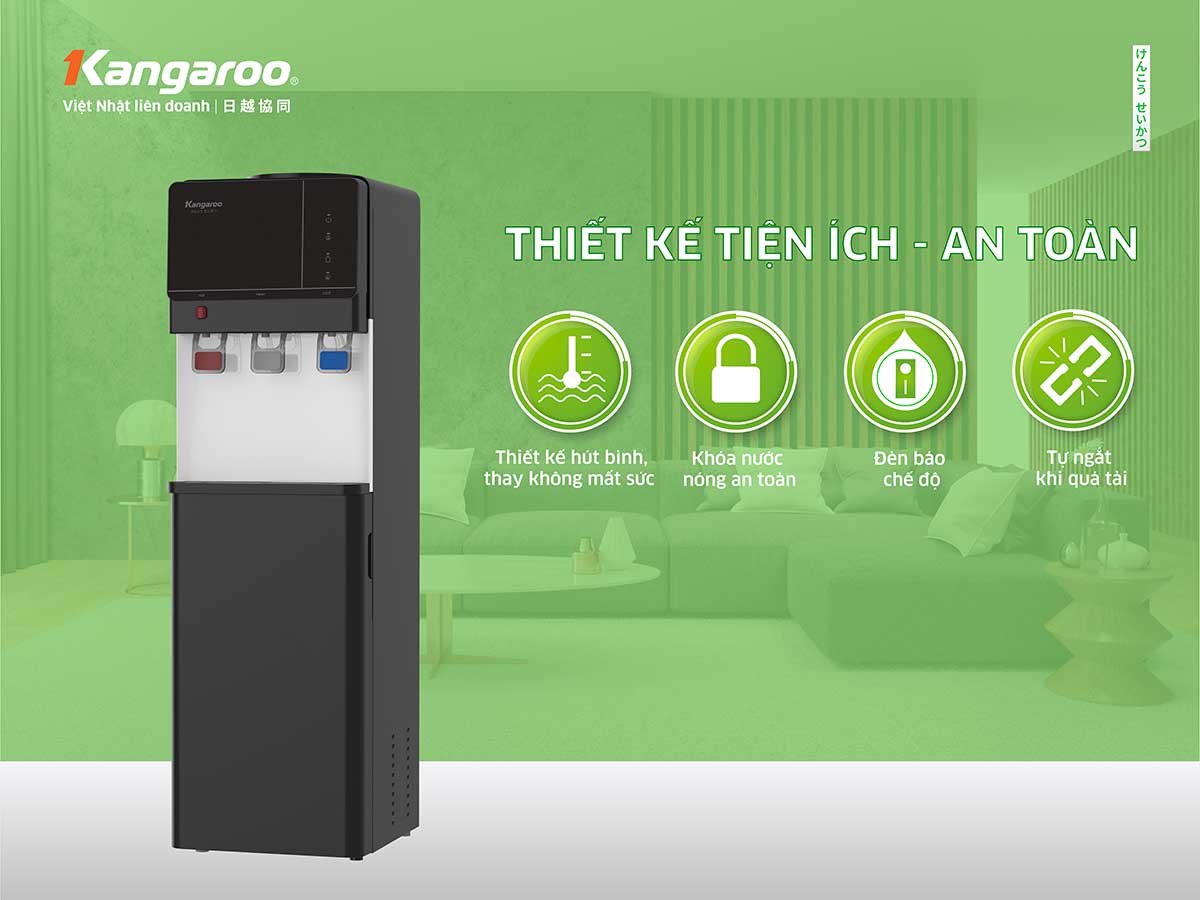 Cây nước nóng lạnh Kangaroo KG64A3 sử dụng công nghệ hút bình. Bình nước được đặt phía dưới giấu trong thân máy không tốn diện tích và rất tiện lợi, giúp dễ dàng thay thế bình nước mới mà không mất sức. Dòng hút bình được ưa chuộng nhờ thiết kế gọn gàng và dễ lau chùi.