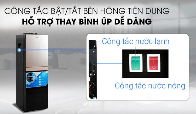 Phía sau cây nước nóng lạnh Midea YL1836S-B được trang bị 2 công tắc bật/tắt nước nóng và nước lạnh độc lập. Nhờ đó, bạn có thể tắt tính năng không sử dụng để tiết kiệm điện năng. Hơn nữa, máy còn có khả năng tiết kiệm điện nhờ tính năng tự ngắt khi đạt đủ nhiệt độ đun nóng, làm lạnh.