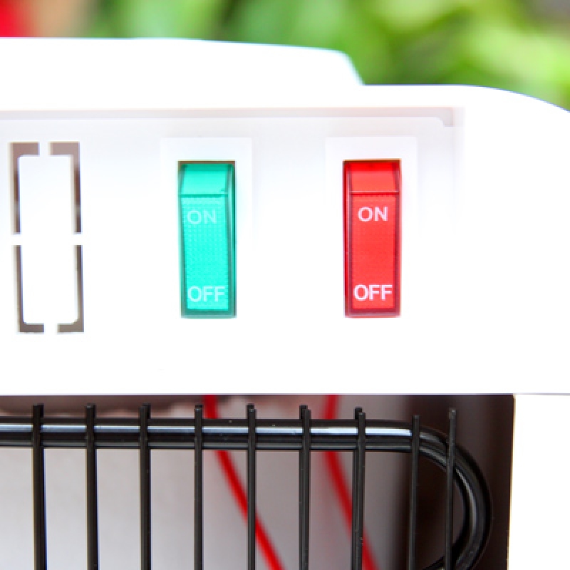 Bên sau thân máy được thiết kế bởi 2 công tắc bật nước nóng và nước lạnh, công tắc màu đỏ sử dụng cho vòi nước nóng, còn công tắc màu xanh sử dụng cho vòi nước lạnh. Máy có công suất 220-240V. Cắm phích điện vào nguồn điện và bật công tắc, chỉ tầm 3-5 phút sẽ tự động làm lạnh hoặc nóng. Và khi cây nước đã đun nóng hoặc lạnh đủ sẽ tự động ngắt điện.