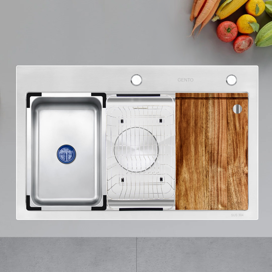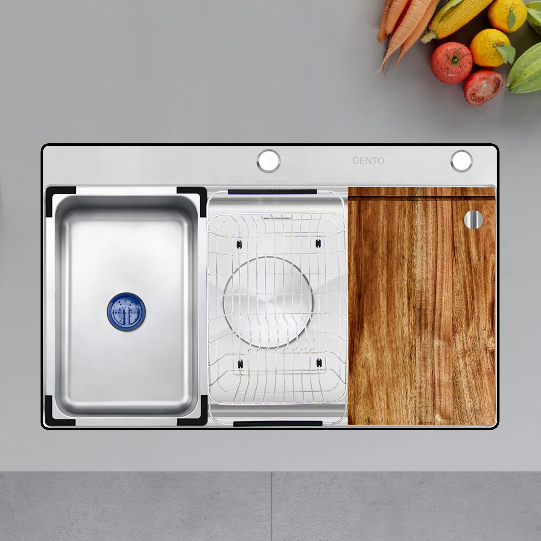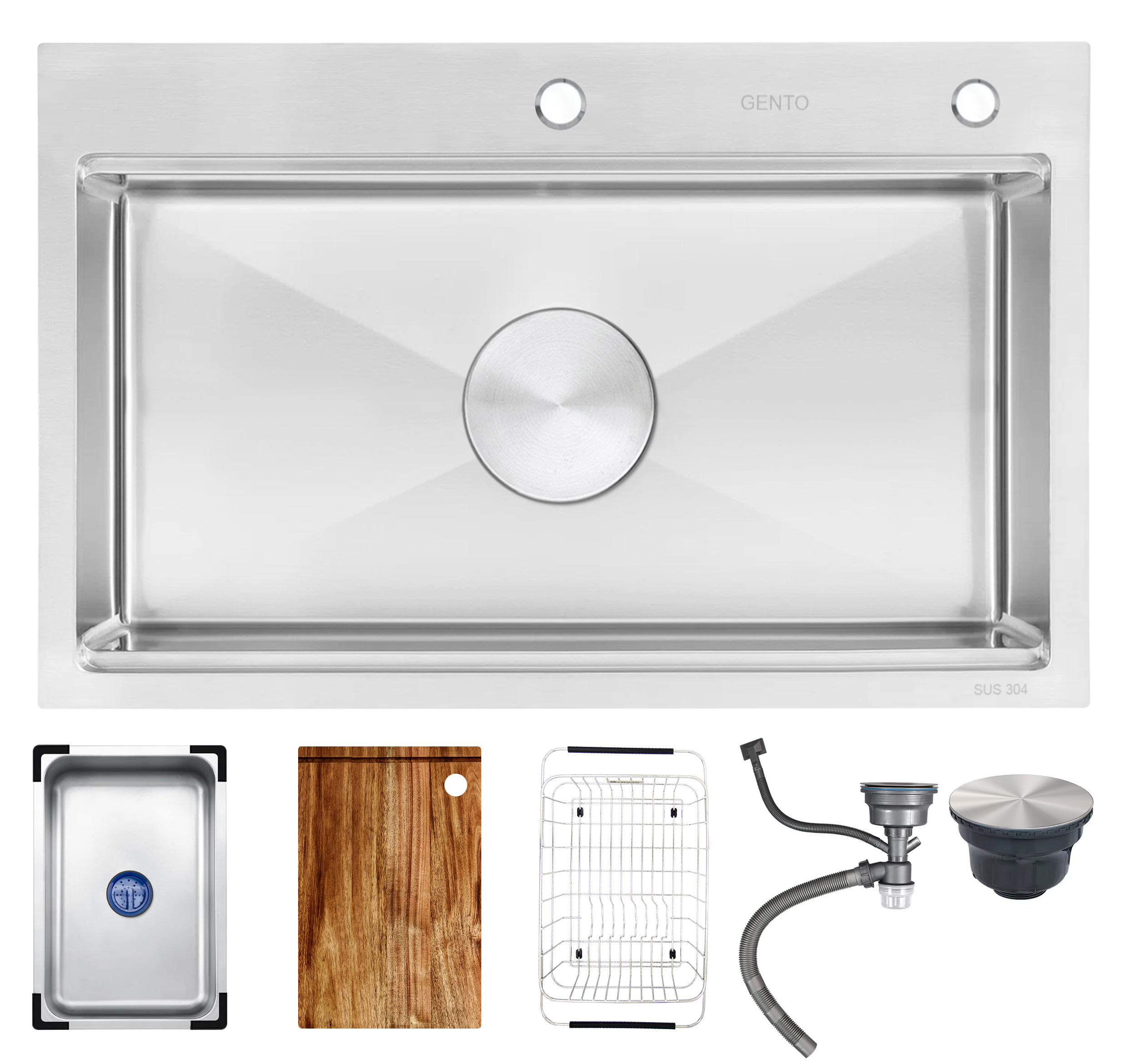 Overmount là dòng sản phẩm luôn chiếm trọn sự quan tâm bởi ngoài công năng tích hợp tuyệt vời, bộ sưu tập còn hướng đến thiết kế phô diễn. Chậu rửa Gento GT04-8050 với thiết kế 1 hố siêu rộng tích hợp phụ kiện đi kèm giúp tối ưu công năng, mang tới trải nghiệm tuyệt vời trong thao tác làm bếp.