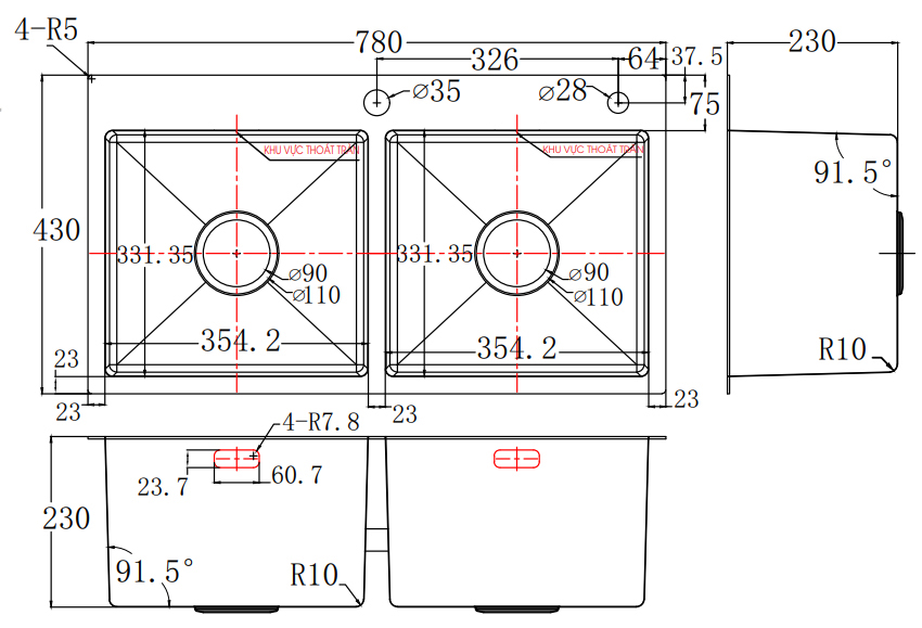 - Thoát nước nhanh, cơ chế ngăn mùi hôi với hệ thống Siphon (ống thoát thải) cải tiến