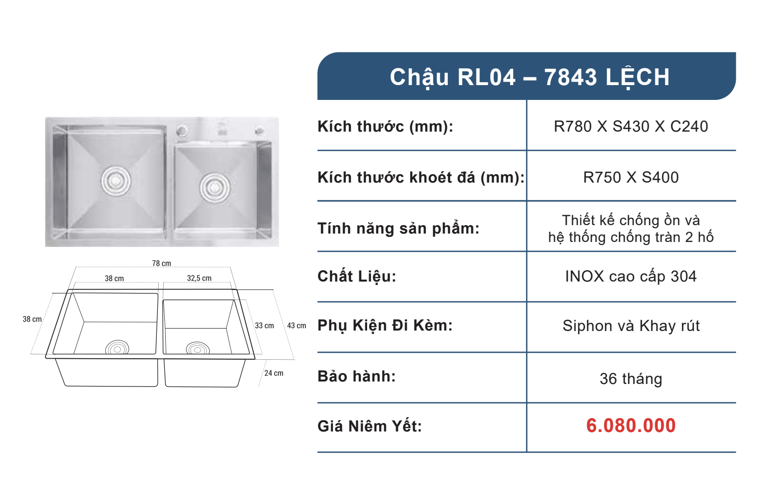 Kích thước của chậu phù hợp với nhiều loại tủ bếp. Chậu được làm từ inox 304 cao cấp, đảm bảo độ bền và an toàn vệ sinh thực phẩm.