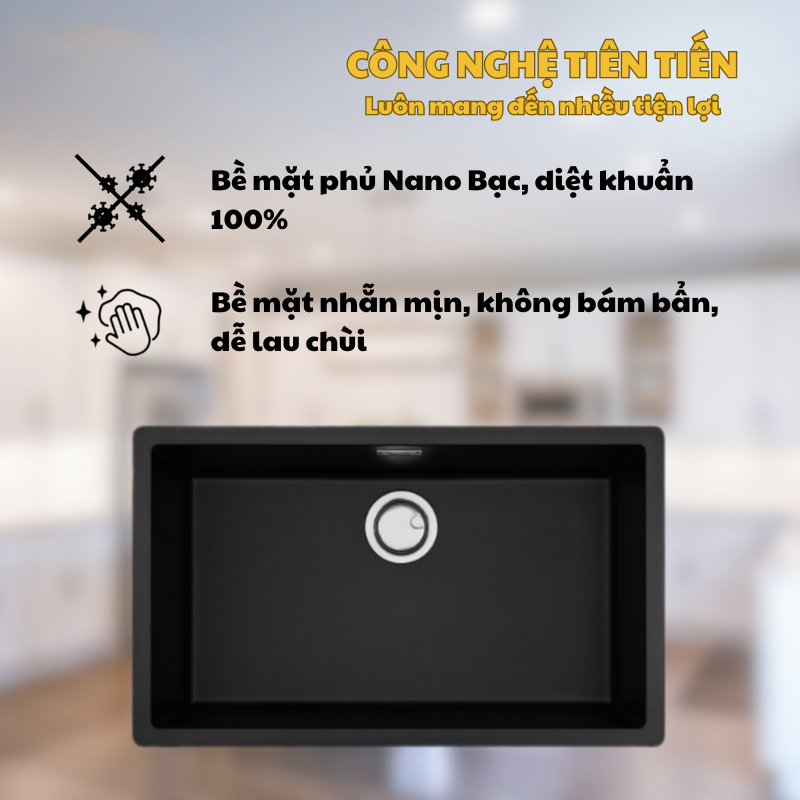 Một trong những điểm nổi bật của chậu rửa chén Malloca ZEN K-13040 là bề mặt được phủ lớp Nano Bạc với khả năng diệt khuẩn lên đến 100%. Công nghệ này giúp ngăn chặn sự phát triển của vi khuẩn, nấm mốc, đảm bảo vệ sinh an toàn cho gia đình bạn. Đặc biệt, đây là tính năng vô cùng hữu ích trong việc bảo vệ sức khỏe, nhất là khi rửa chén bát và thực phẩm.