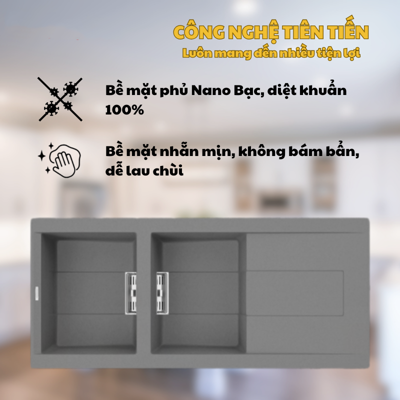Một trong những điểm nổi bật của chậu rửa chén Malloca SMART K-500 là bề mặt được phủ lớp Nano Bạc với khả năng diệt khuẩn lên đến 100%. Công nghệ này giúp ngăn chặn sự phát triển của vi khuẩn, nấm mốc, đảm bảo vệ sinh an toàn cho gia đình bạn. Đặc biệt, đây là tính năng vô cùng hữu ích trong việc bảo vệ sức khỏe, nhất là khi rửa chén bát và thực phẩm.