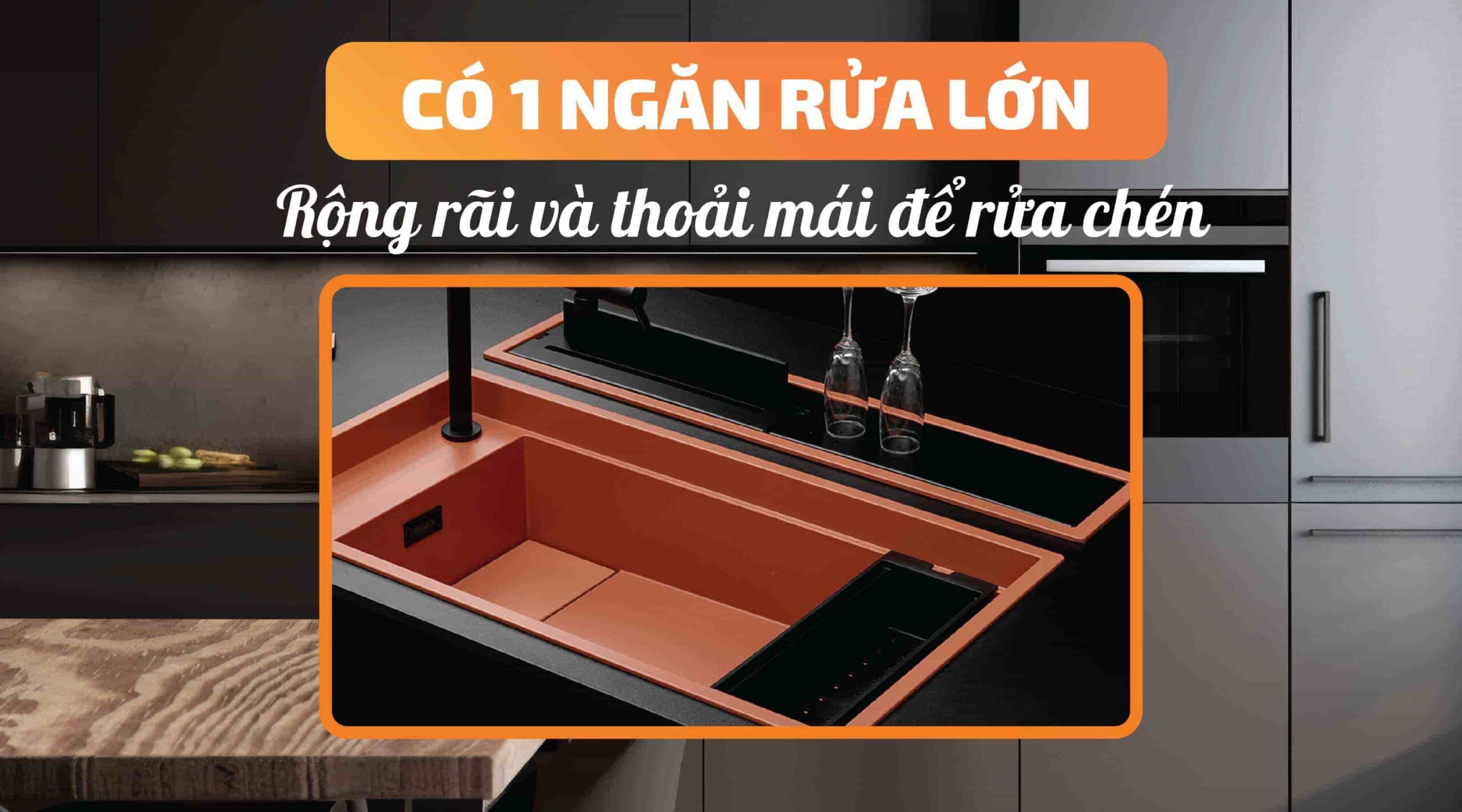 Ngăn rửa của chậu lớn rộng rãi, thoải mái rửa chén. Ngăn dưới sở hữu lòng chậu sâu và rộng, giúp bạn có thể rửa chén, đĩa, xoong nồi cùng lúc thuận tiện. Bên cạnh đó, việc sơ chế thực phẩm hằng ngày cũng trở nên thoải mái và tiện lợi hơn.