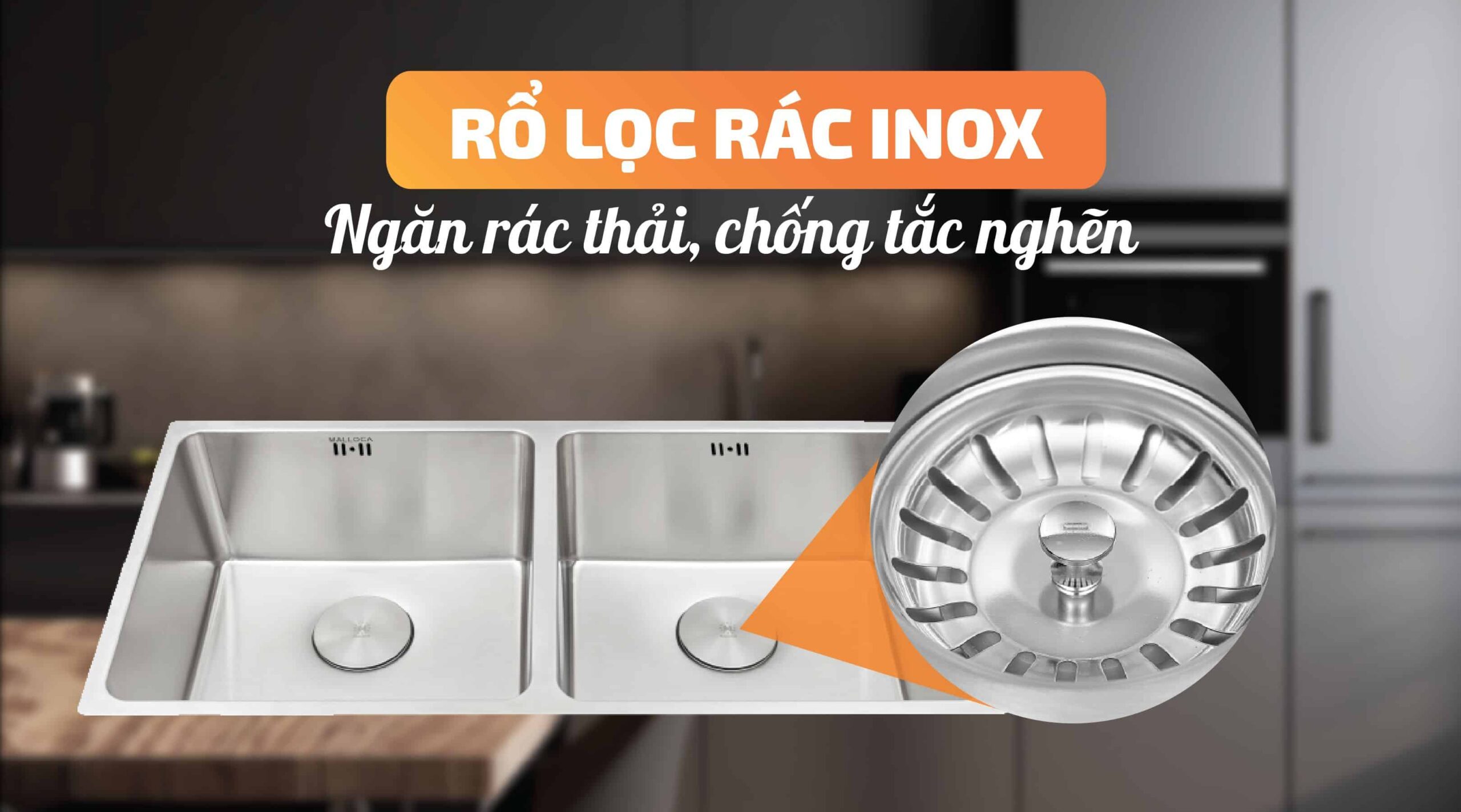 Chậu rửa chén đôi MS 6075 được trang bị rổ lọc rác bằng inox tiện lợi. Đây là một thiết kế đơn giản, nhưng rất tiện ích. Nó giúp tạo ra trải nghiệm sử dụng tốt nhất cho người dùng.