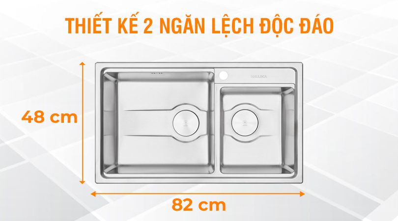 Sản phẩm có thiết kế 2 ngăn lệch độc đáo, giúp bạn dễ dàng phân loại thực phẩm và chén bát khi rửa. Ngăn lớn bên trái có thể sử dụng để rửa thực phẩm, rau củ, còn ngăn nhỏ bên phải có thể sử dụng để rửa chén bát, xoong nồi.